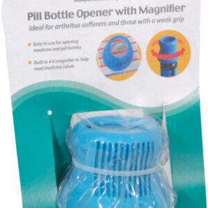 This handy pill/medicine bottle opener is ideal for users with a weak grip or arthritis. The opener is ribbed both on the inside and the outside for superior grip and includes a 4X magnifier on the top for reading the fine print on labels. The opener is small enough to fit into a purse or a bag so that it can be used when away from home.