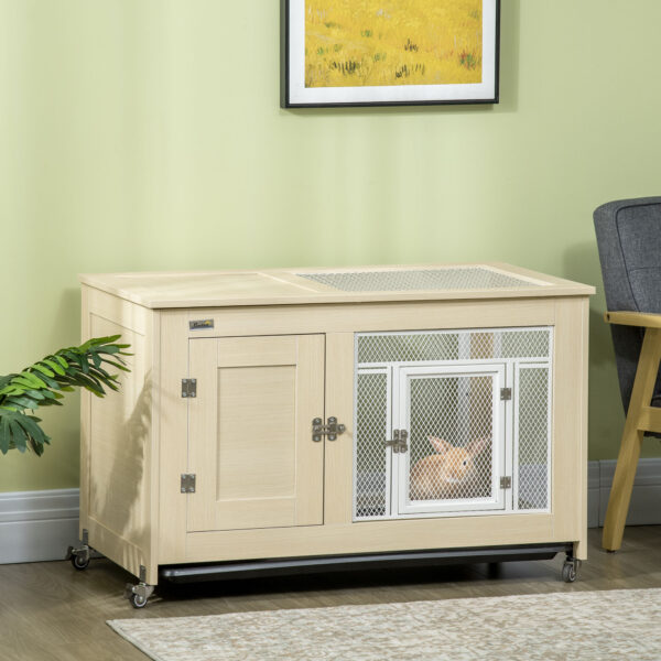 PawHut Rabbit Hutch with Wheels, Guinea Pig Cage with Openable Roof, Bunny Run with Slideout Tray, Small Animal House for Indoor, 94 x 53 x 56cm, Oak