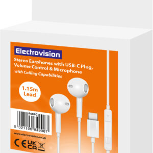 Electrovision Stereo Earphones Earbuds with USB-C plug, volume control, microphone and 1.15m lead. The headphones are designed for ease of use and have a built-in volume control and microphone for hands-free call handling.