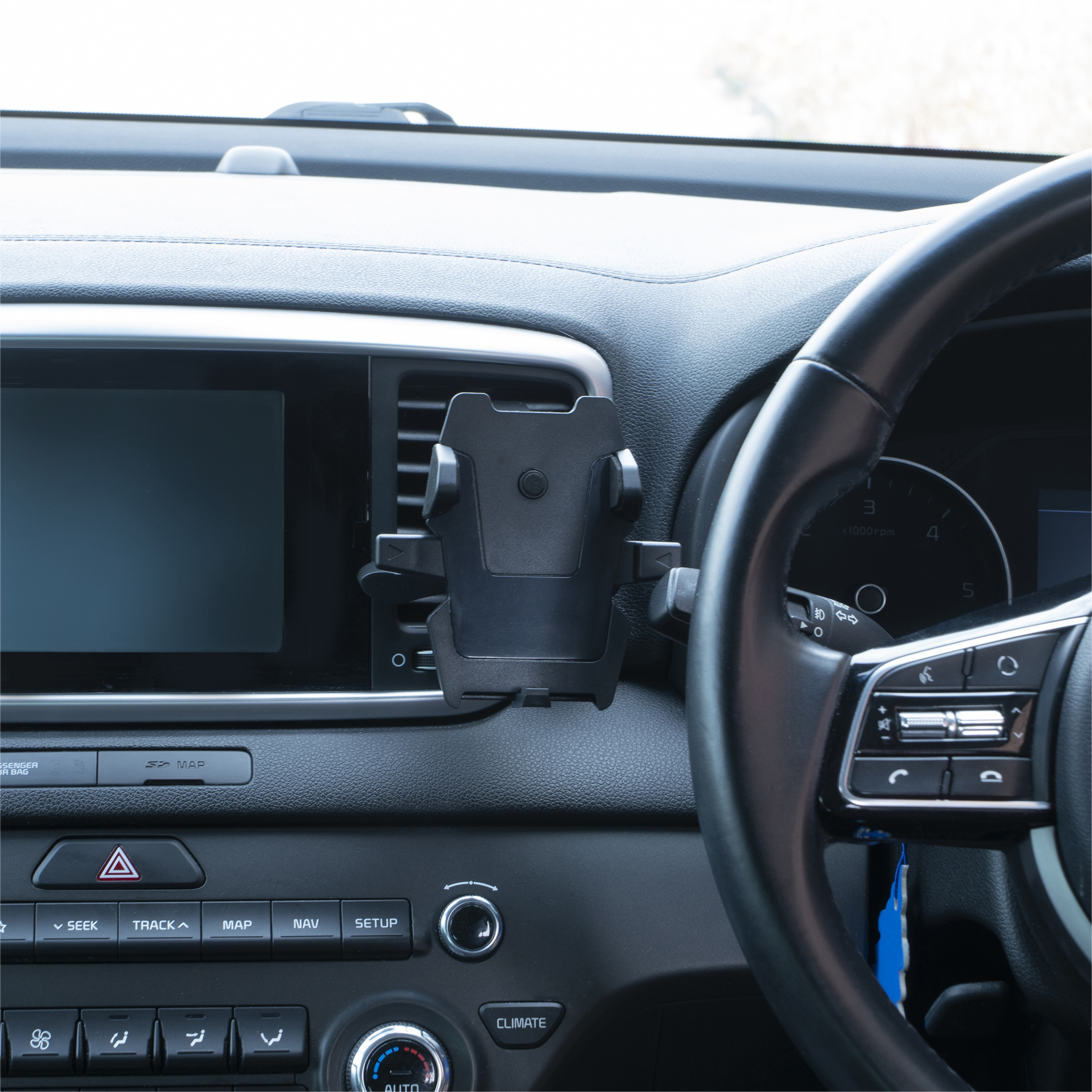 This mobile phone holder is designed to secure your mobile phone whilst you are driving, your phone will be secure even while turning, driving over pot holes and speeds bumps and on uneven roads. Simply insert the top grasping point into your air vent and the 2 lower points will rest on the vent for stability. This holder is designed to accommodate the majority of mobile phones thanks to the clamp style design, open the holder by pressing the Open tabs on either side, insert your phone and the action of pushing your phone to the back of the holder makes the side clamps shut around your phone securely. The adjustable swivel ball is designed so that you can achieve the optimum viewing angle. The phone holder will accommodate most phones with a maximum width of 9cm. Primarily designed for use in your car this holder can also be used as a desk phone holder. Never phone/text and drive.