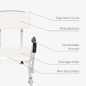 Simple, sturdy, and multifunctional, the HOMCOM shower and bath bench is ideal for those who need extra help in the shower or struggle with limited mobility. It features a sturdy aluminum frame, padded armrests, and a high-density polyethylene seat and backrest to provide extra security and comfort. It also includes adjustable legs for required height and non-slip rubber safety tips for additional stability.
