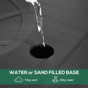 - Base can be filled with sand or water, keeping it firmly to the ground