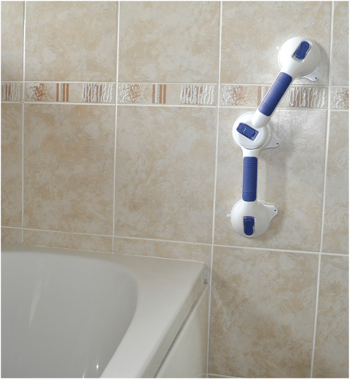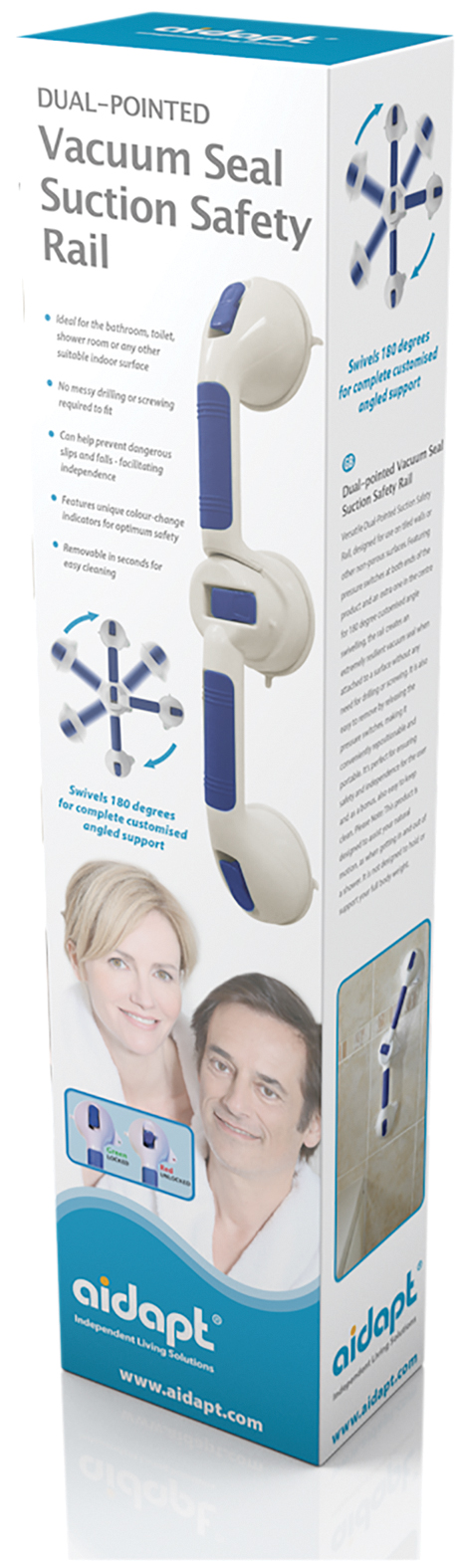 Versatile Dual-Pointed Suction Safety Rail, designed for use on tiled walls or other non-porous surfaces. Featuring pressure switches at both ends of the product and an extra one in the centre for 180 degree customised angle swivelling, the rail creates an extremely resilient vacuum seal when attached to a surface without any need for drilling or screwing. It is also easy to remove by releasing the pressure switches, making it conveniently repositionable and portable. It s perfect for ensuring safety and independence for the user and is easy to keep clean. Please Note: This product is designed to assist your natural motion, as when getting in and out of a shower. It is not designed to hold or support your full body weight.