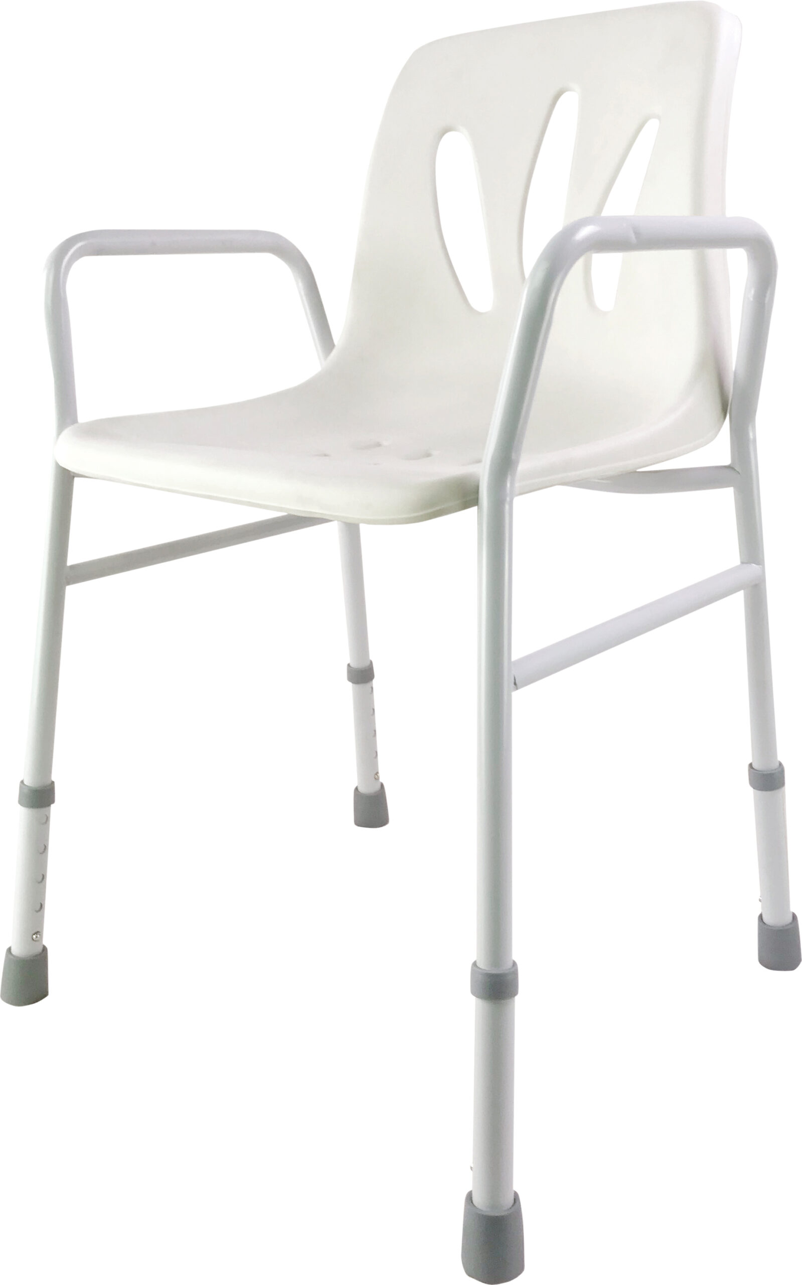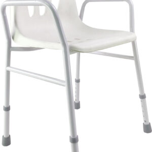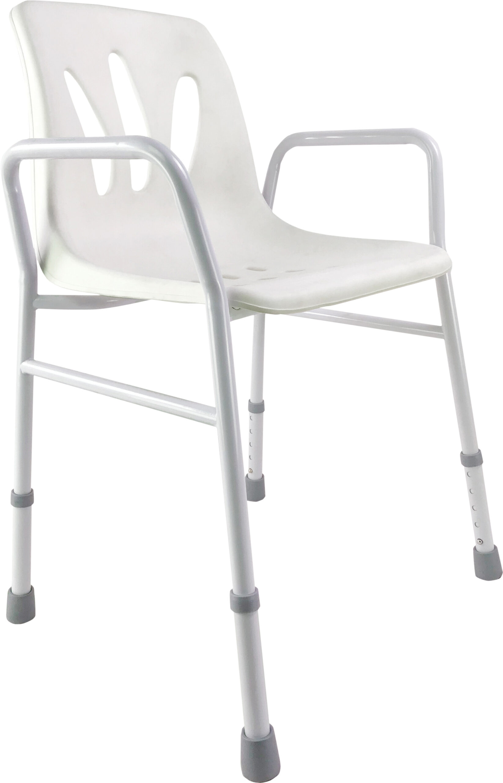 The chair can be used in the bathroom or shower and can be set to desired height. It features drainage holes, supportive back, hand rails, and non-slip ferrules.