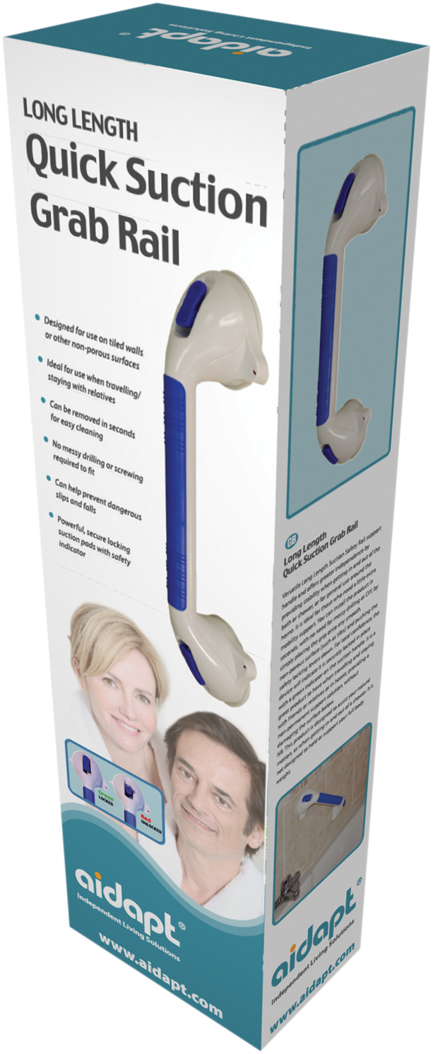 Versatile Long Length Suction Safety Rail, designed for use on tiled walls or other non-porous surfaces. Featuring pressure switches at both ends of the product, the rail creates an extremely resilient vacuum seal when attached to a surface without any need for drilling or screwing. It is also easy to remove by releasing the pressure switches, making it conveniently repositionable and portable. It s perfect for ensuring safety and independence for the user and is also easy to keep clean. Please Note: This product is designed to assist your natural motion, as when getting in and out of a shower. It is not designed to hold or support your full body weight.