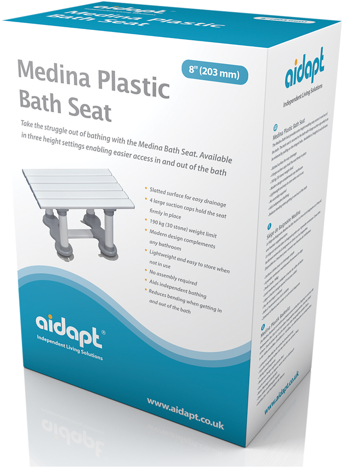The Medina Bath Seat provides extra height enabling easy access in and out of the bath. The Medina Bath Seat is constructed from high quality, fully reinforced slatted plastic and meets MHRA safety guidelines. The bath seat is secured to the bath with 4 large suction caps which can be removed by pulling on the integral tabs. Available in 3 heights to suit all users.