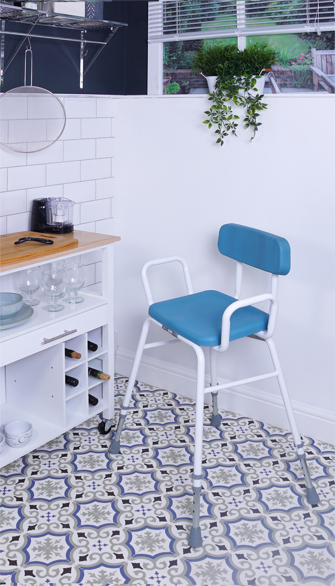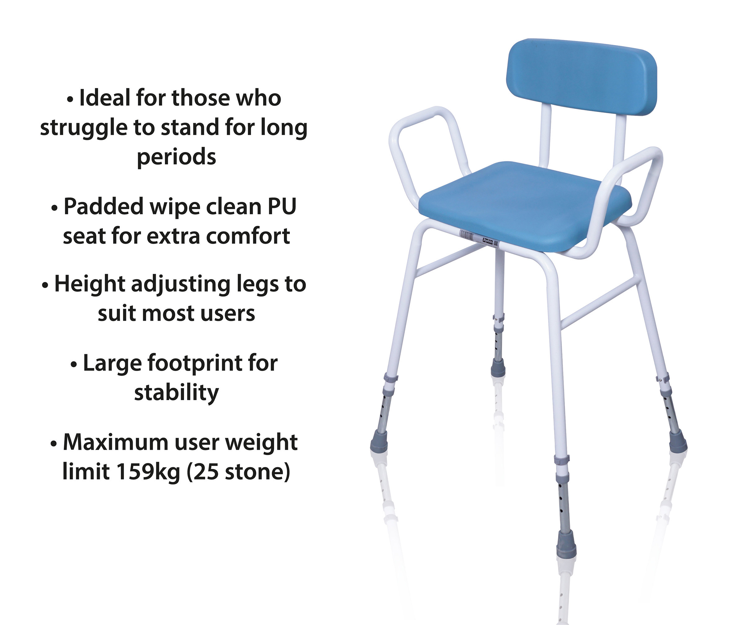 The Perching Stool is height adjustable with a comfy, seamless PU seat that is easily wiped clean. It is multi-use and ideal for people recovering from hip and other surgeries who struggle to stand whilst brushing their teeth or chopping vegetables in the kitchen. This stool is lightweight and easily transported from room to room around your home. Supplied with non-slip ferrules for added safety and peace of mind, armrests for comfort and is supplied with a padded backrest for comfort. The perching stool is easily adjusted in height using simple e-clips. Delivered fully assembled with no tools required.