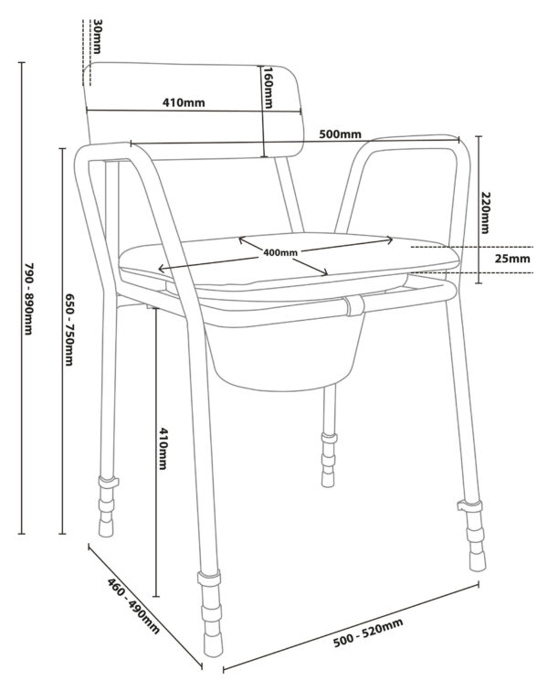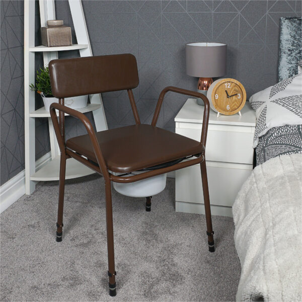 The Bedside Commode Chair is height adjustable and stackable; a neat and practical commode chair suitable for use as a bedroom or bathroom commode. It is ideal for use in a care home setting or in a property with only a downstairs WC. The Bedside Commode Chair has a removeable, 5 litre pail with lid and a padded overseat for discretion, when not in use. The upholstery of the commode is well padded and is vinyl welded to reduce the possibility of bacteria build up. It is easily wipe cleaned with a mild detergent. Maximum User Weight Limit is 170kg. The commode chair is delivered fully assembled and height adjustment is acheived using simple pop in/out e-clips.