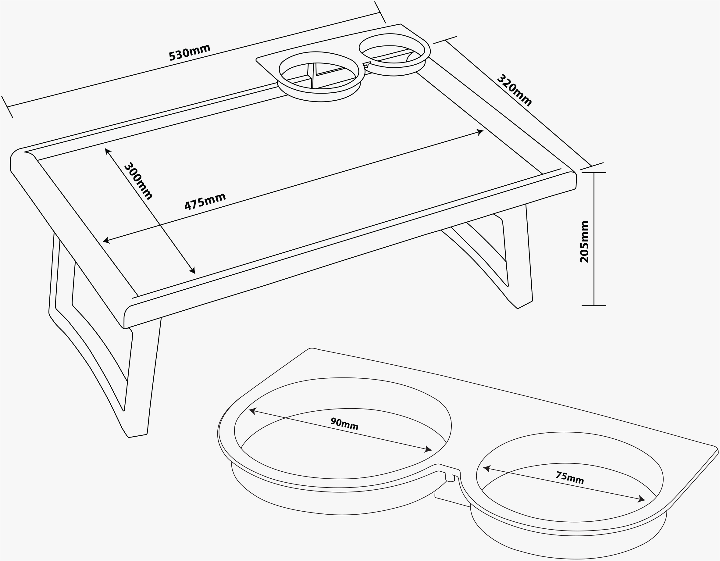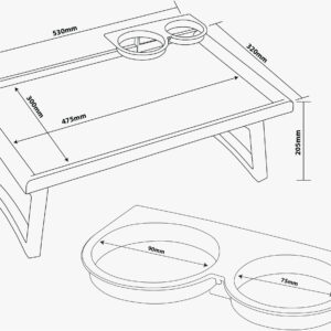 - SECURE; Lip on the table top to stop items rolling off. Two holders for keeping glasses and accessories in place