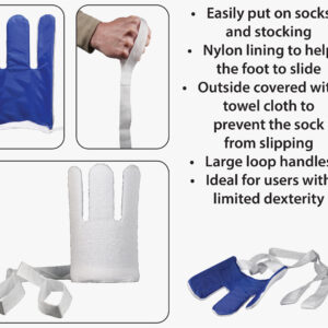 The Sock and Stocking Dressing Aid makes putting on socks and stockings easy. Large loop handles at the end of strong 32 inch straps make this a popular dressing aid for arthritis sufferers. The nylon lining of the sock and stocking aid helps the foot to slide easily through the garment.