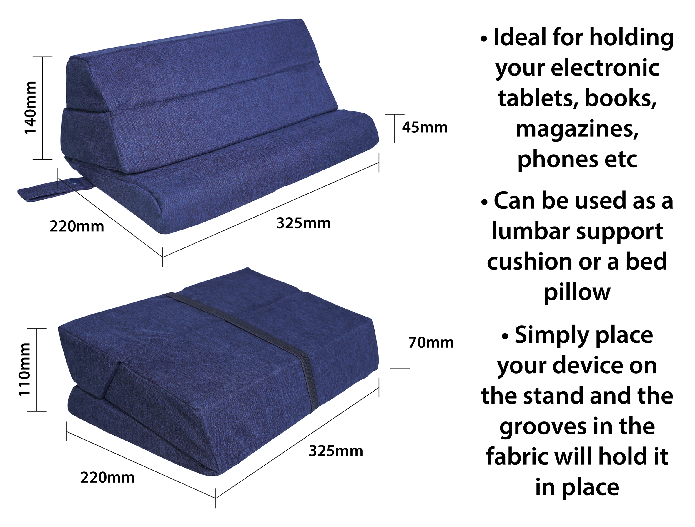 The tablet holder pillow stand is great for use with I-pad’s, eBook readers, tablets, books and magazines. Enjoy your favourite book, film, media or just browse the web with this handy tablet stand. Simply place your device or book on the stand and view in comfort. Your hands are free to surf the web or turn the pages of your book. The tablet holder is lightweight and comfortable.