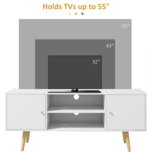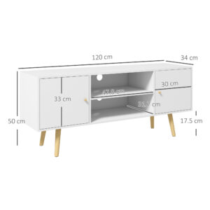 Upgrade your living room with this HOMCOM media console. This TV stand does more than holding your TV, it has two open shelves and two cupboards to provide large storage space for your favourite movies, a collection of video games or books you love to read. Additionally, there are two cable holes for organising wires without the mess. Without a doubt, this media unit will be a perfect companion for your relaxing moments.