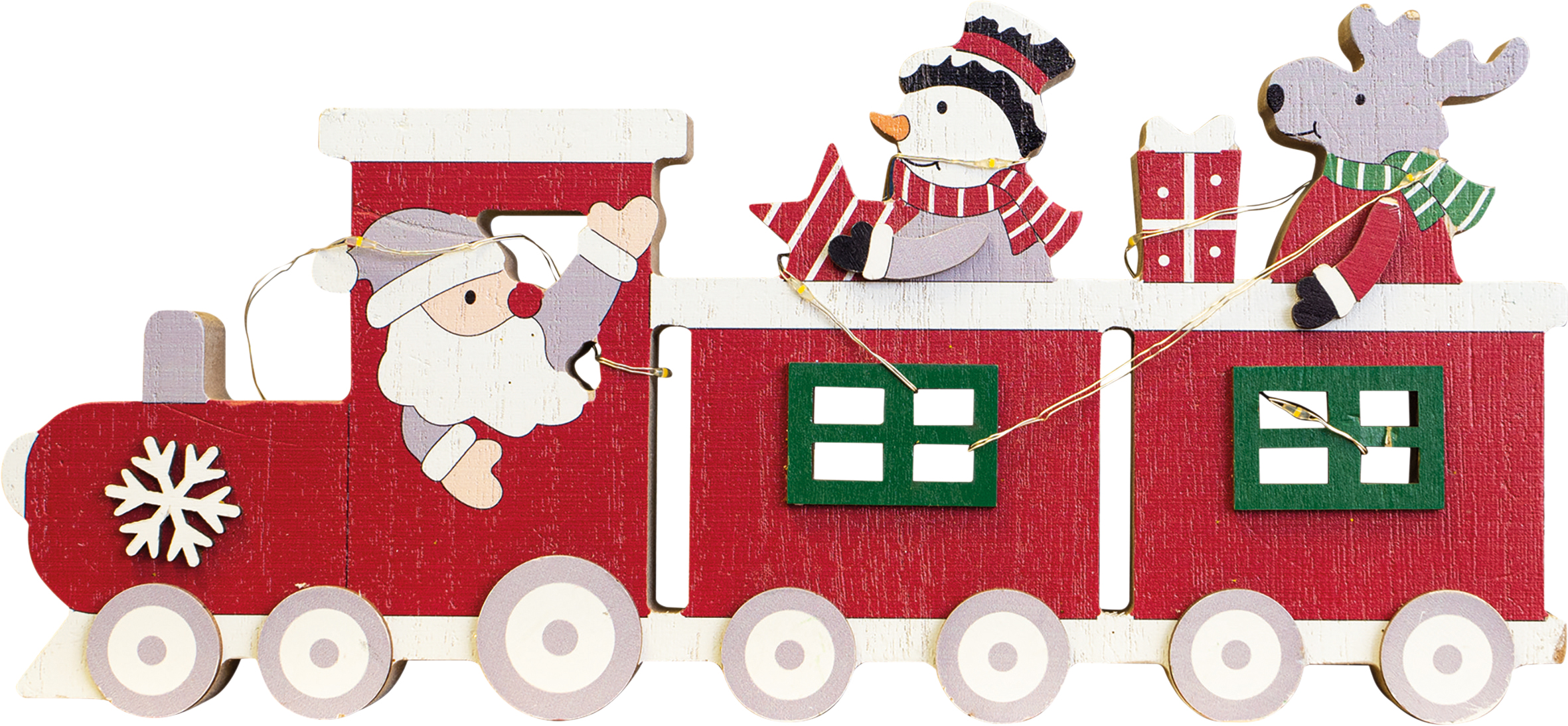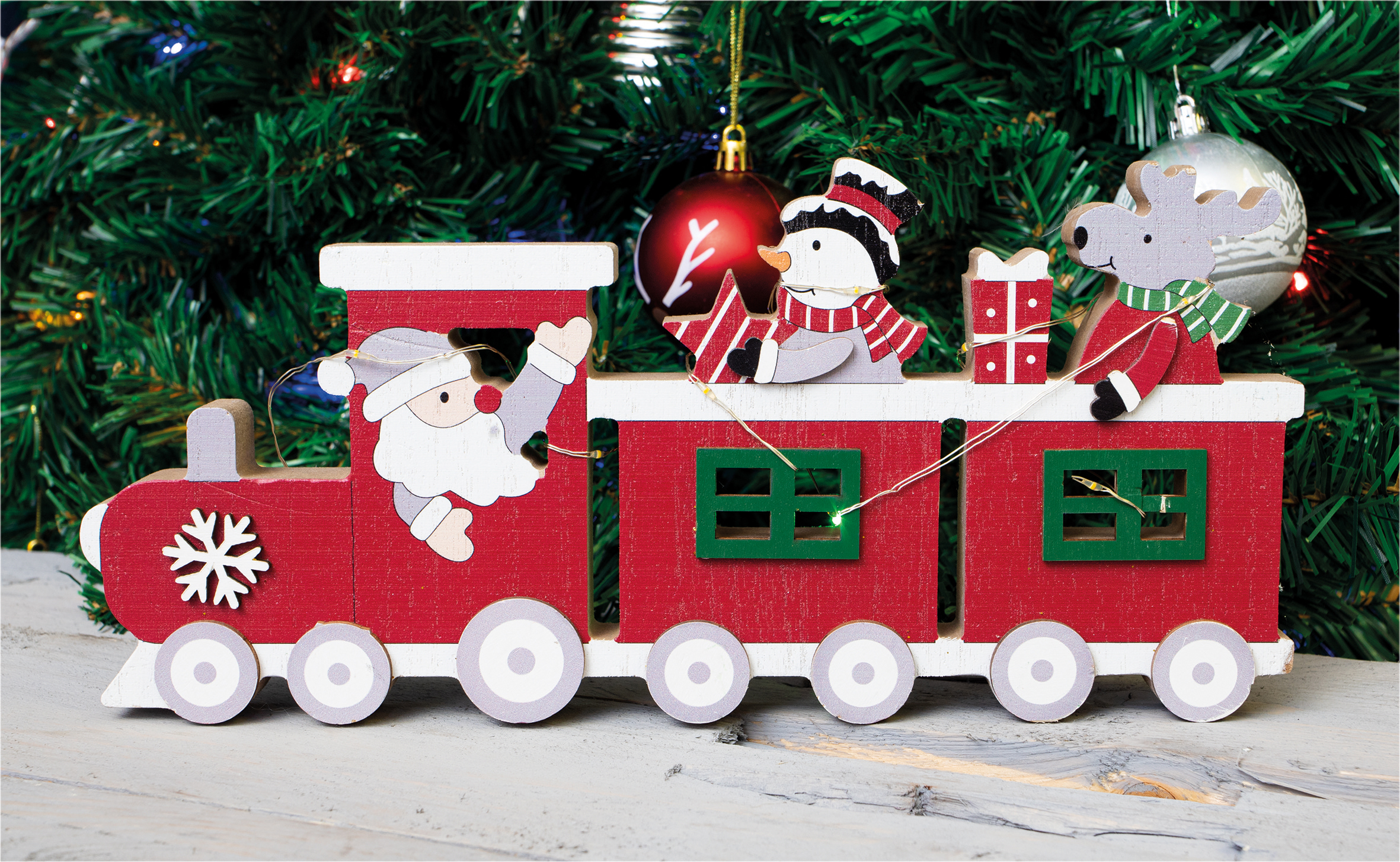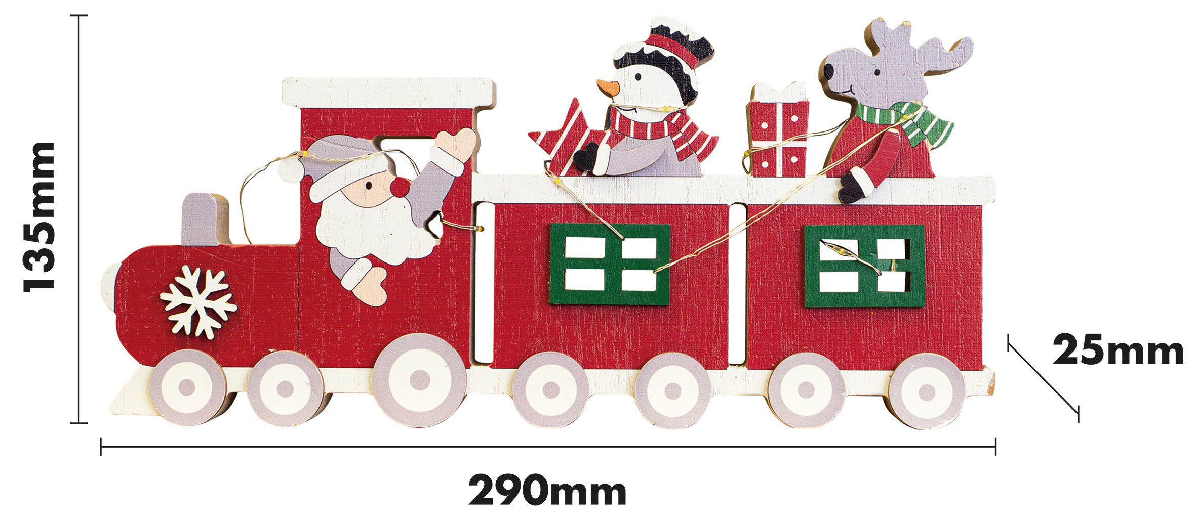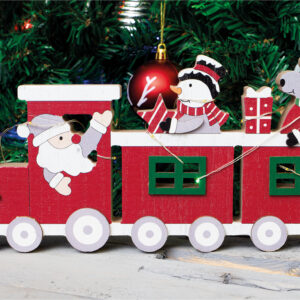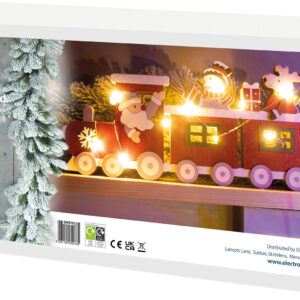 This beautifully crafted festive train light up ornament will look perfect on your window sill or table tops, in fact anywhere you want to create a wonderfully festive atmosphere. This train ornament is a fantastic alternative to the traditional Christmas candle bridges. The train is being driven by Father Christmas and his passengers are a snowman and a reindeer. LED string lights are wound round the train and create a lovely warm glow when switched on. The lights are battery operated, simply insert 2x AAA batteries (not supplied) and enjoy this festive light in the comfort of your own home.