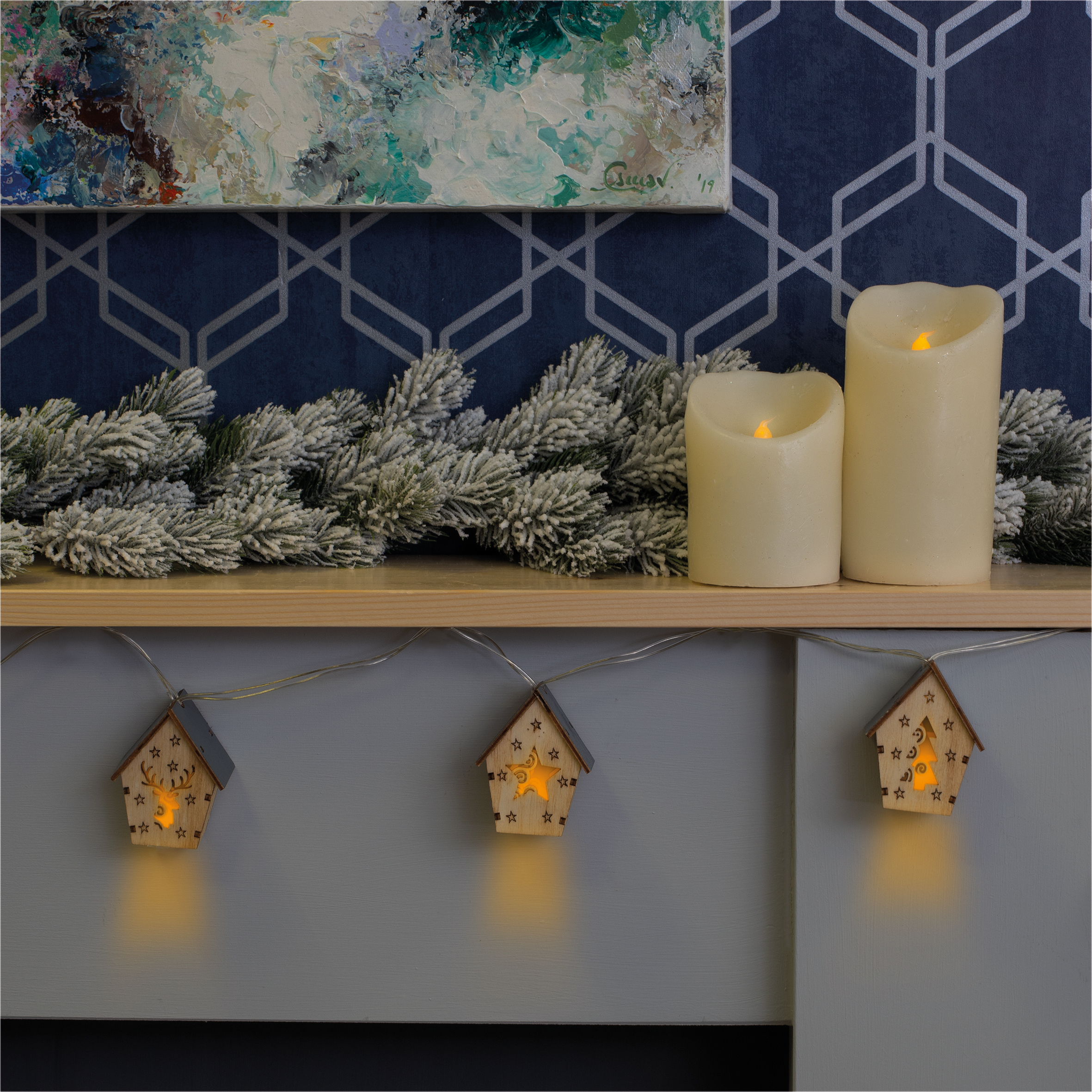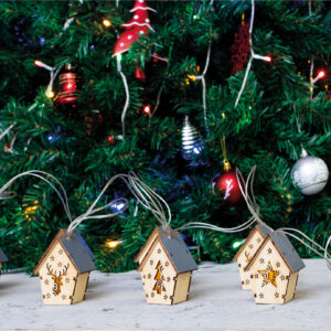 Make Christmas extra special this year with this wooden house light string featuring 10 wooden houses with grey roofs. These houses feature a festive star cut-out which creates a beautiful silhouette when lit. Each house is illuminated by an LED light. Each of the houses measures7x5.5 cm and is separated by20 cm of wire. This light is battery operated making it suitable to place around the Christmas tree, curtain poles, fire places, bannisters and bed frames, in fact any place where you may not have a power socket. Requires 2x AA batteries (not supplied).