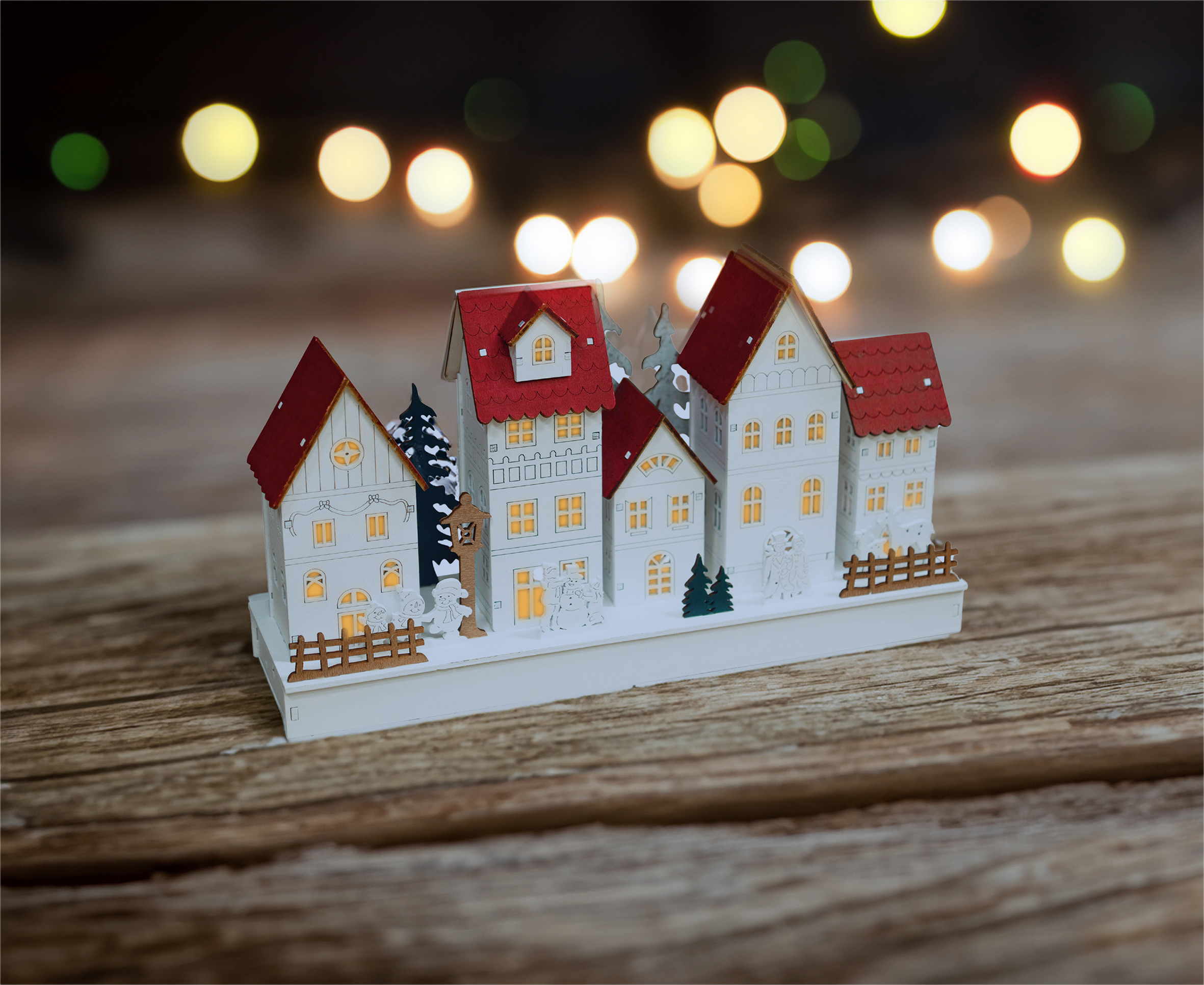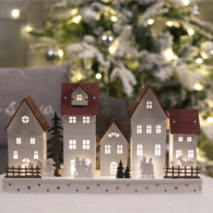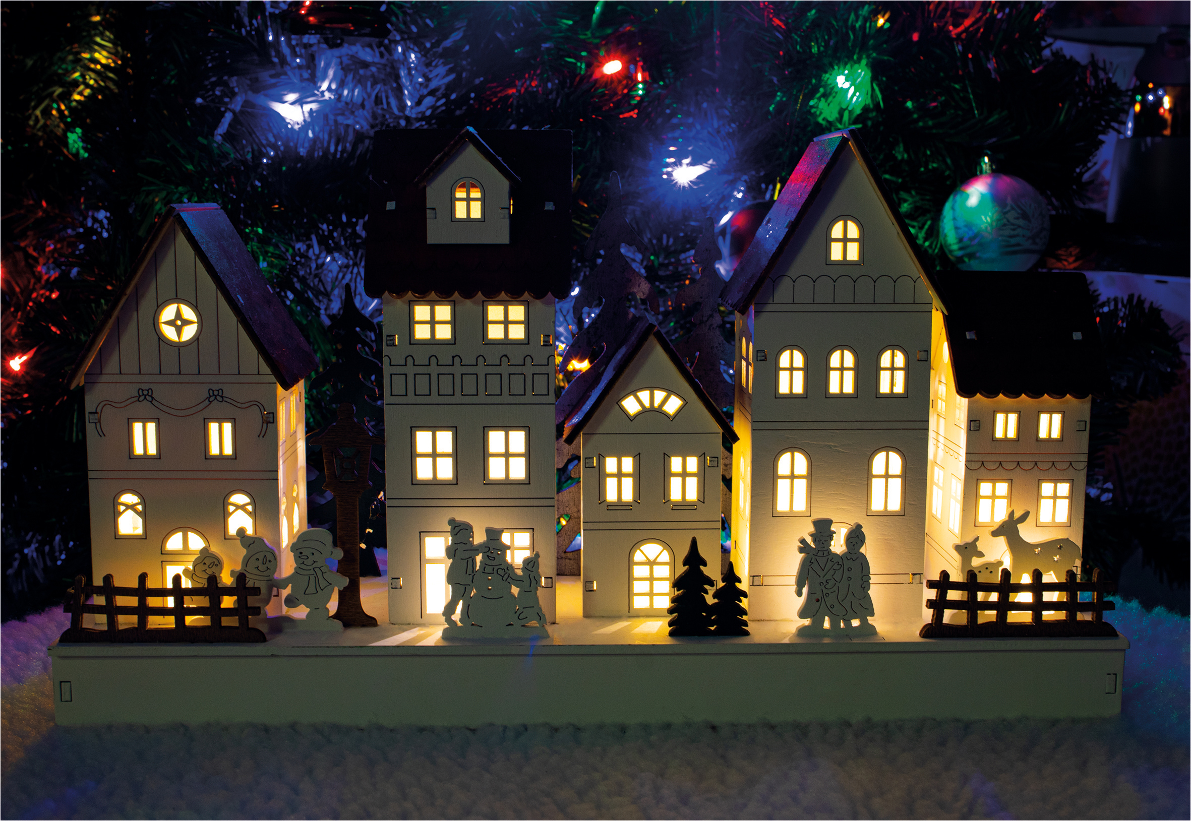 This beautifully crafted light up festive scene will look perfect on your window sill or table tops, in fact anywhere you want to create a wonderfully festive atmosphere. This LED festive scene is a fantastic alternative to the traditional Christmas candle bridges. The scene features festive carvings such as snowmen, reindeers, Christmas trees, stars, children playing and houses in white and red wood tones. The LEDs are placed underneath the carvings to create festive silhouettes .The scene is battery operated, simply insert 2x AA batteries (not supplied) and enjoy this festive light in the comfort of your own home.