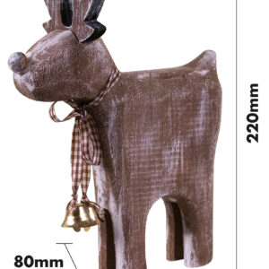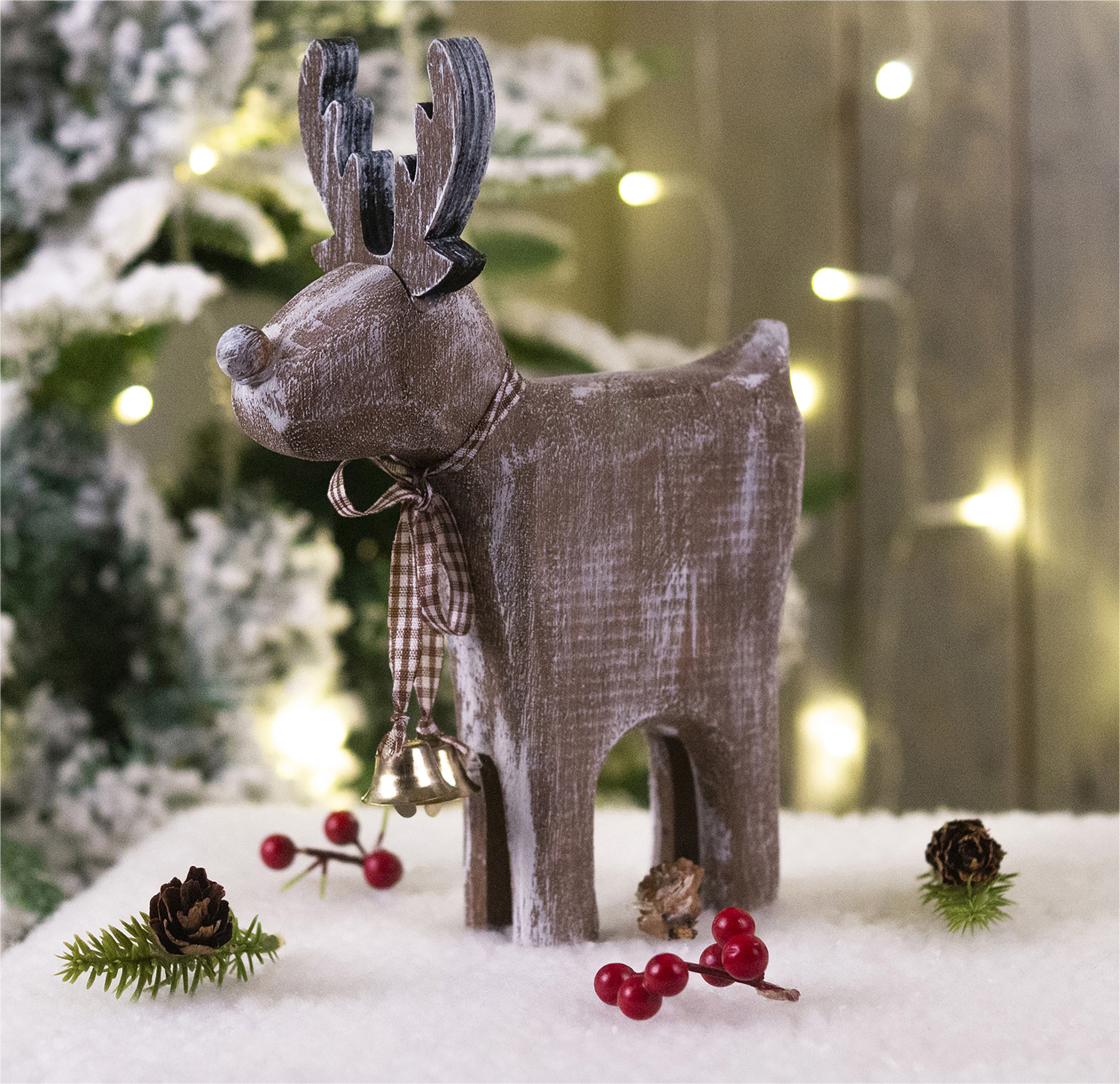 Create a sense of style this Christmas with our wooden reindeer decoration, the distressed finish gives it a rustic yet on trend look. The reindeer would be perfect placed on window ledges or coffee tables, in fact anywhere you want to create a wonderfully festive atmosphere. The reindeer is dressed for the occasion with a very jaunty brown check collar topped with Christmas bells.