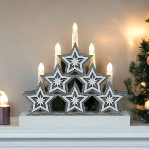 Illuminate your holiday season with the Xmas Haus natura wood LED light up Christmas candle bridge decoration. This stunning decoration features a charming arch design with five candle holders, adorned with stars, adding a touch of magic and warmth to your Christmas decor. Crafted from natural wood, this candle bridge arch exudes a timeless elegance that enhances the festive ambiance. The warm LED lights within each candle holder emit a soft, flickering glow, creating a cozy and inviting atmosphere in your home.