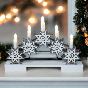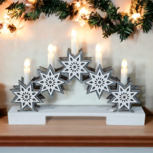 Illuminate your holiday season with the Xmas Haus natura wood LED light up Christmas candle bridge decoration. This stunning decoration features a charming arch design with five candle holders, adorned with stars, adding a touch of magic and warmth to your Christmas decor. Crafted from natural wood, this candle bridge arch exudes a timeless elegance that enhances the festive ambiance. The warm LED lights within each candle holder emit a soft, flickering glow, creating a cozy and inviting atmosphere in your home.
