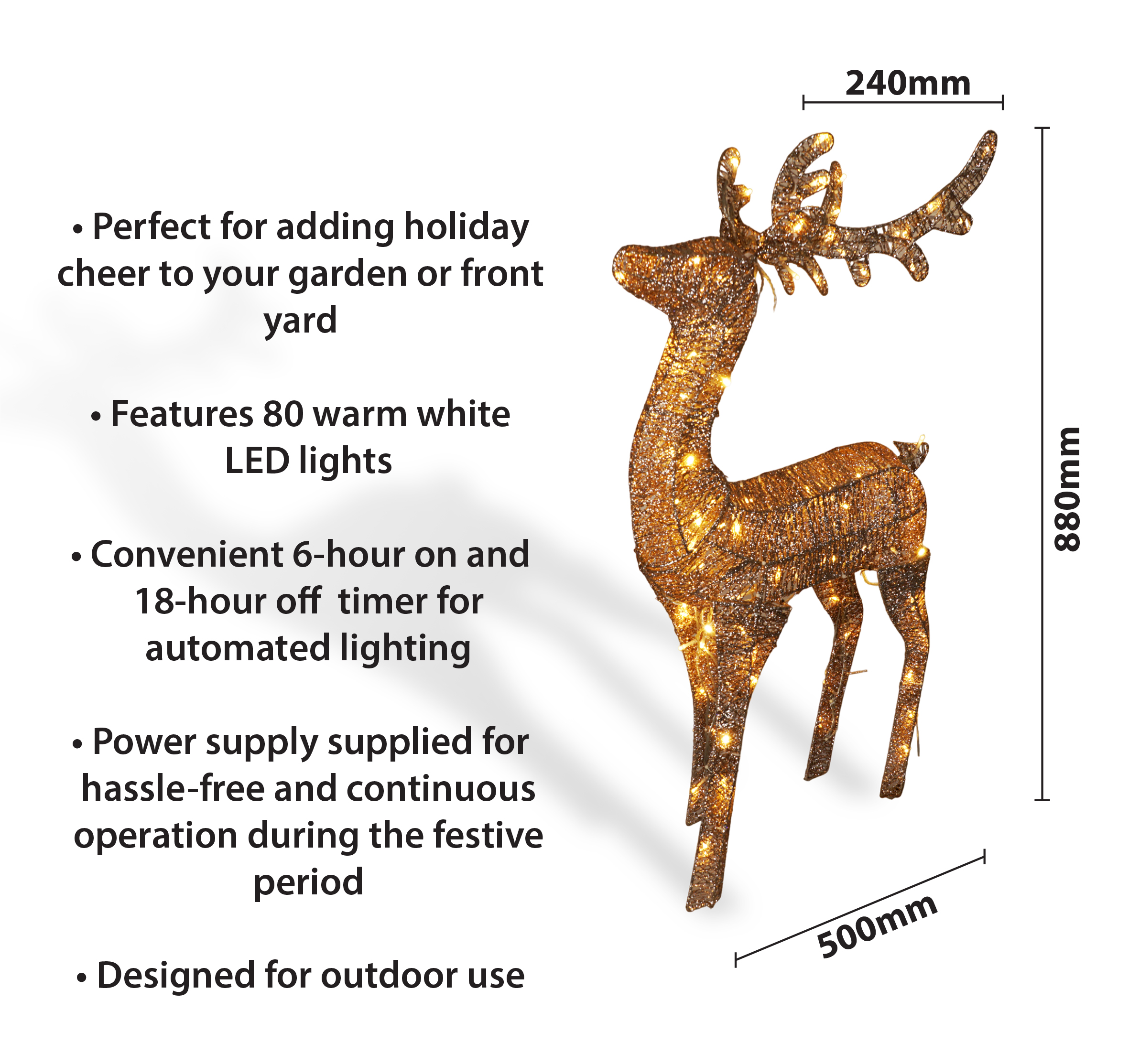 Transform your outdoor space into a winter wonderland with the Xmas Haus Outdoor Light Up Reindeer Christmas Decoration. This captivating decoration features 80 warm white LED lights that will bring a magical glow to your garden or front yard during the festive season. Supplied with a power supply and 6 hour on 18 hour off timer.