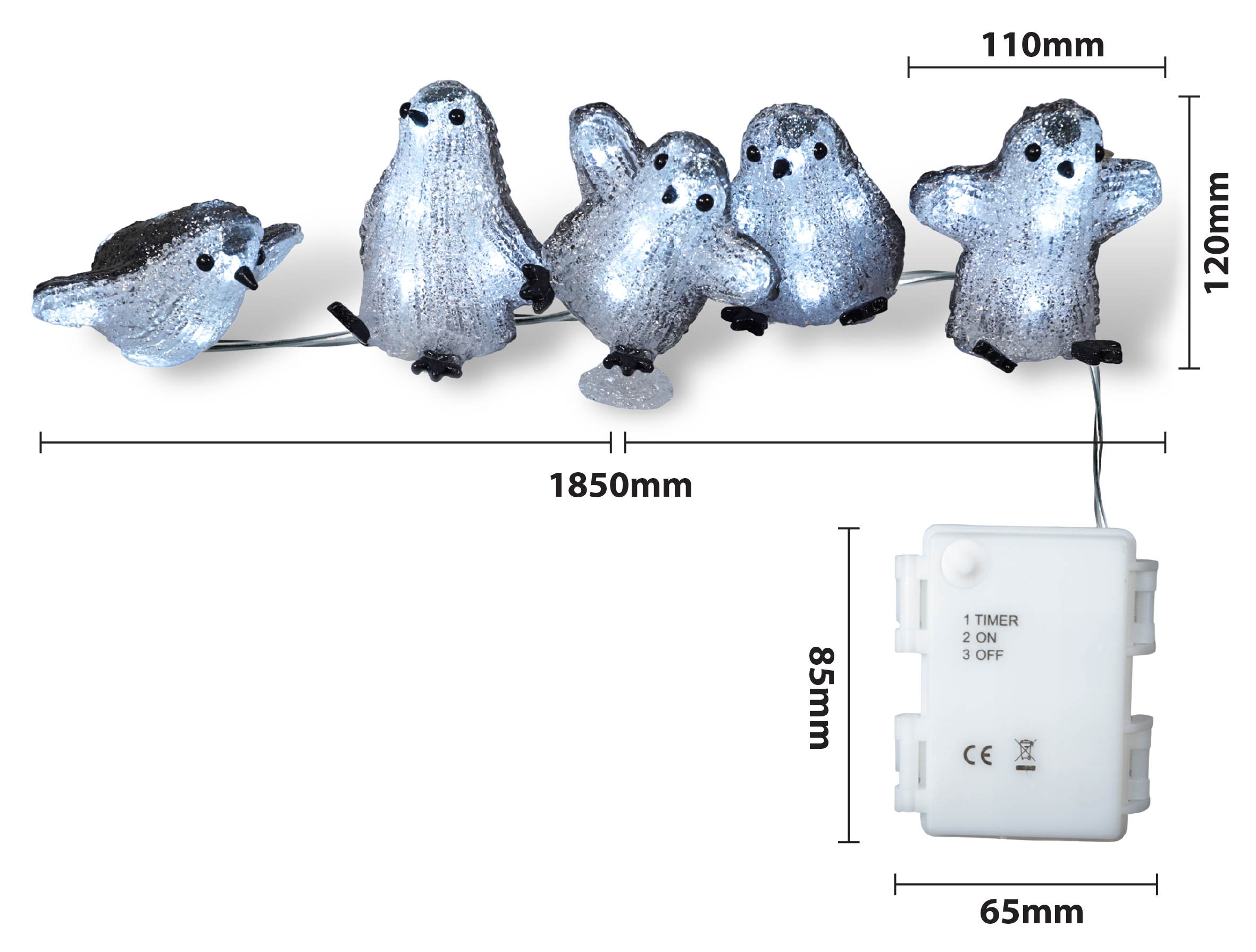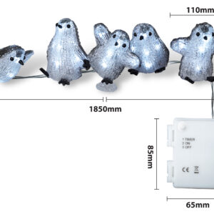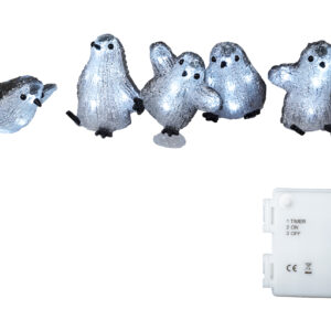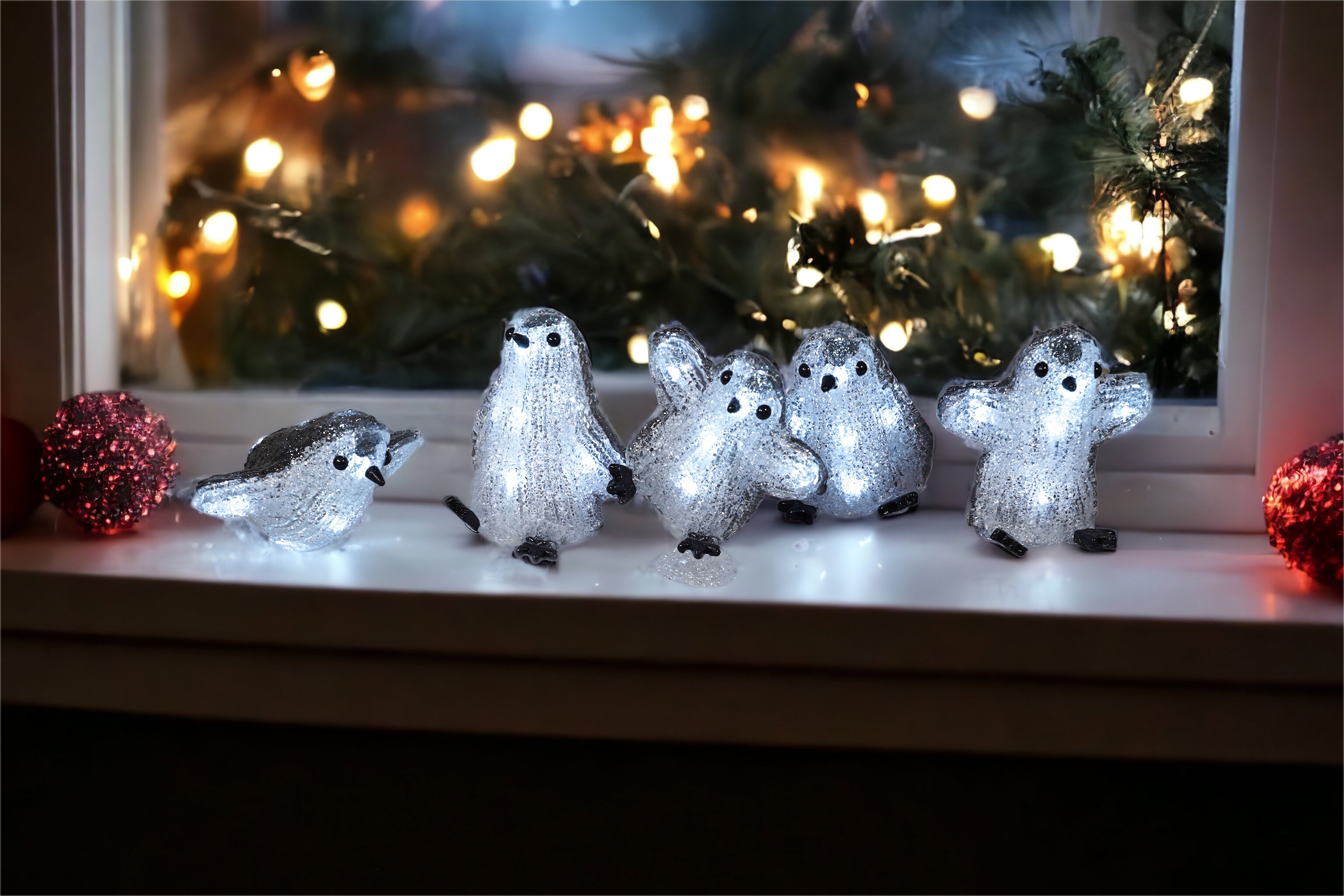 Xmas Haus Set of 5 Acrylic Outdoor/Indoor penguins. This delightful ensemble of penguins brings a whimsical charm to your holiday decor, creating a festive atmosphere both indoors and outdoors. With their captivating lights and convenient battery operation (3 x AA not supplied) , these penguin are sure to become the highlight of your Christmas display. Each penguin in the set is crafted from durable acrylic material, ensuring longevity and resistance to outdoor elements. Their translucent bodies beautifully catch and reflect the light, creating a magical glow that adds warmth and joy to any space. The intricate details, such as the fluffy feathers and charming smiles, make these penguin truly endearing.