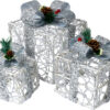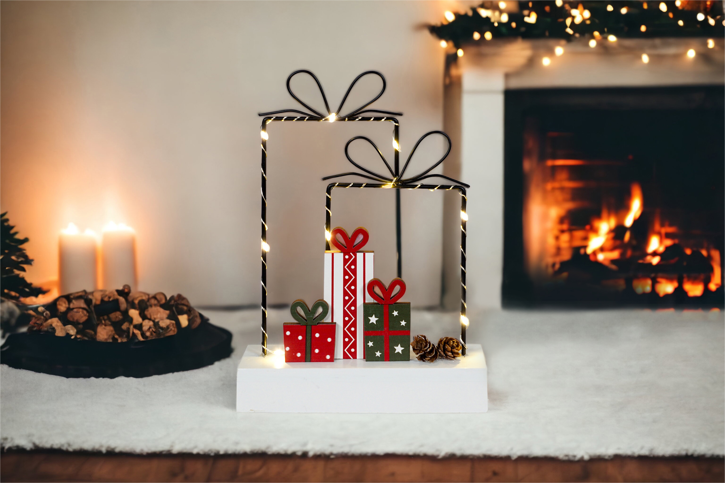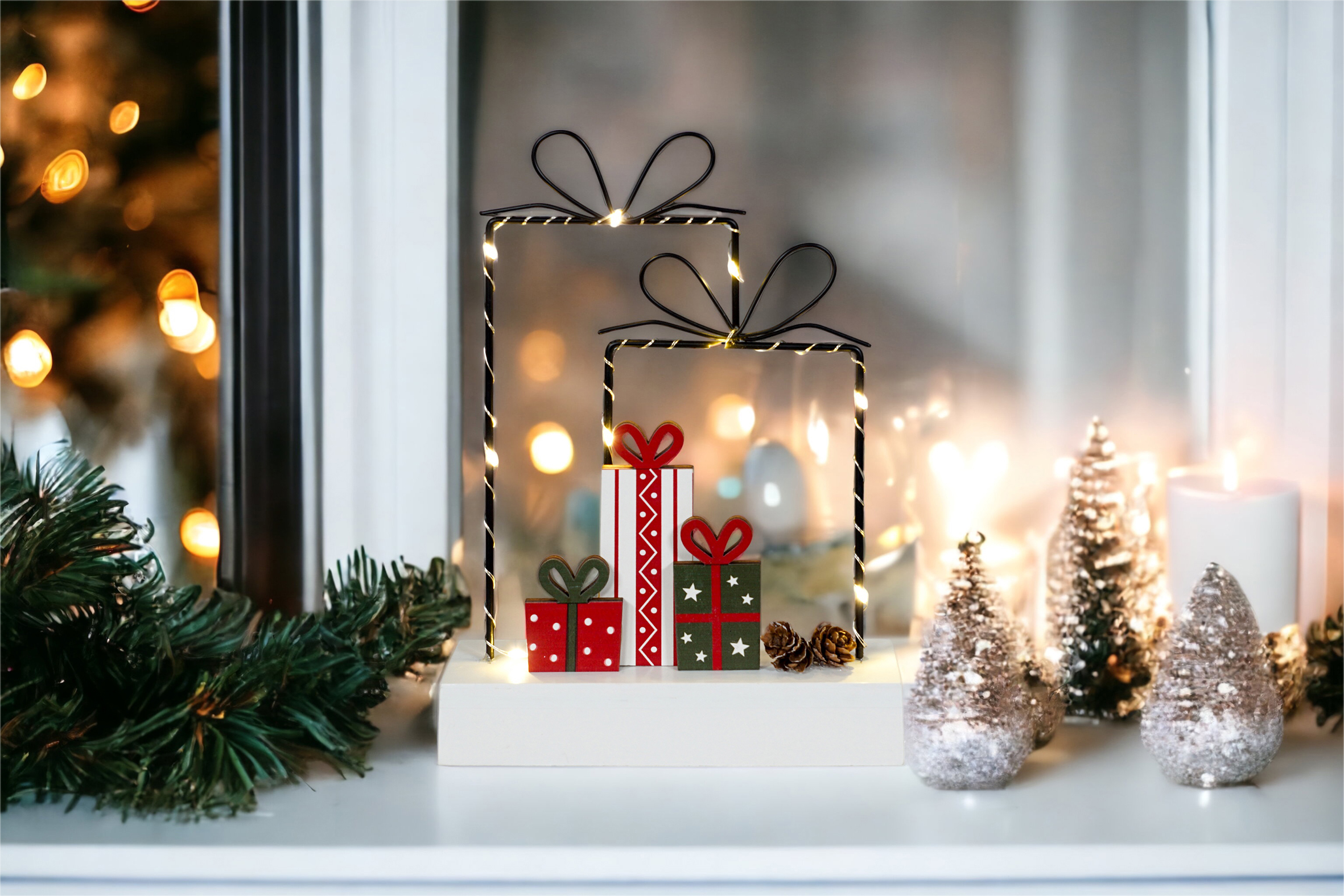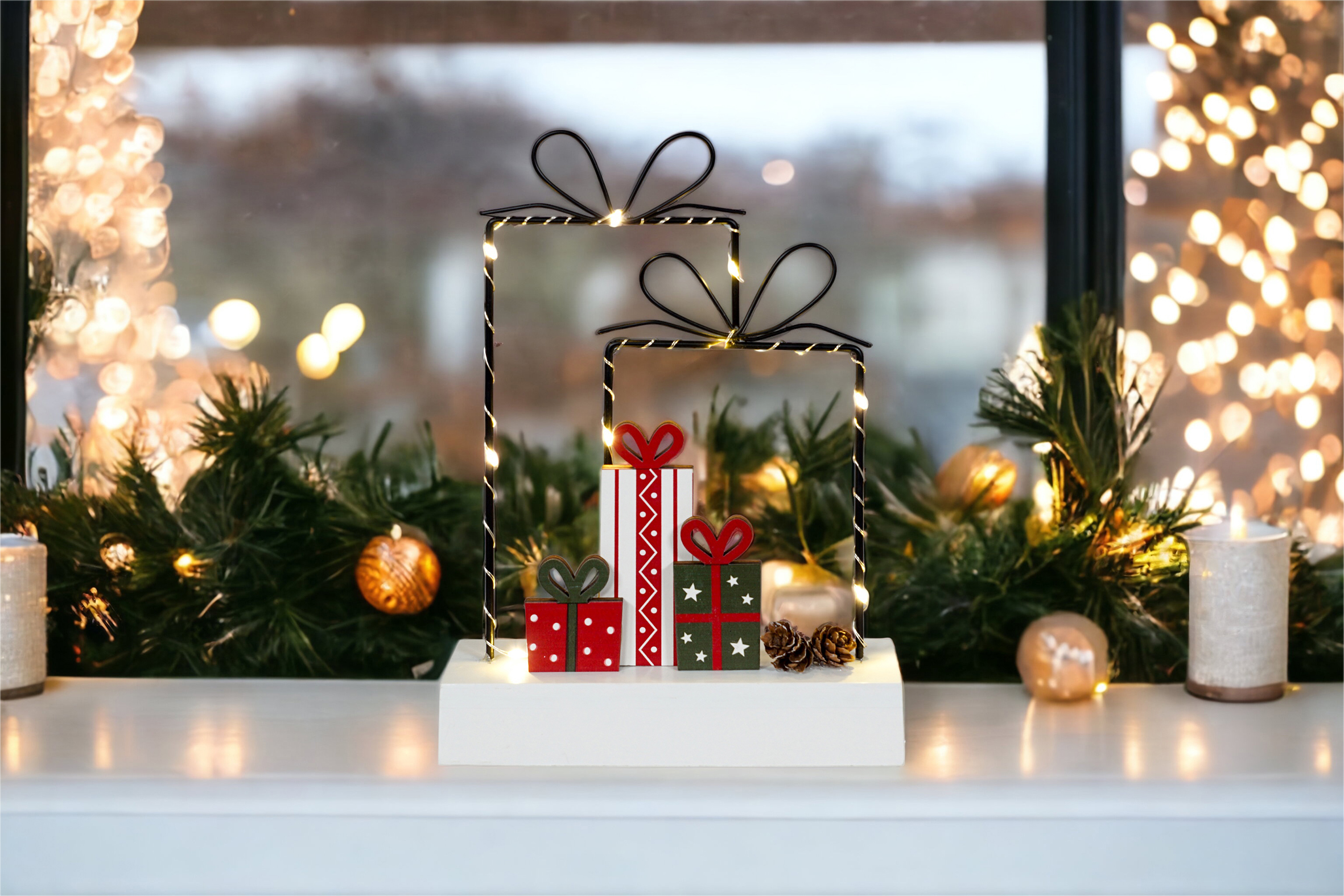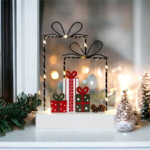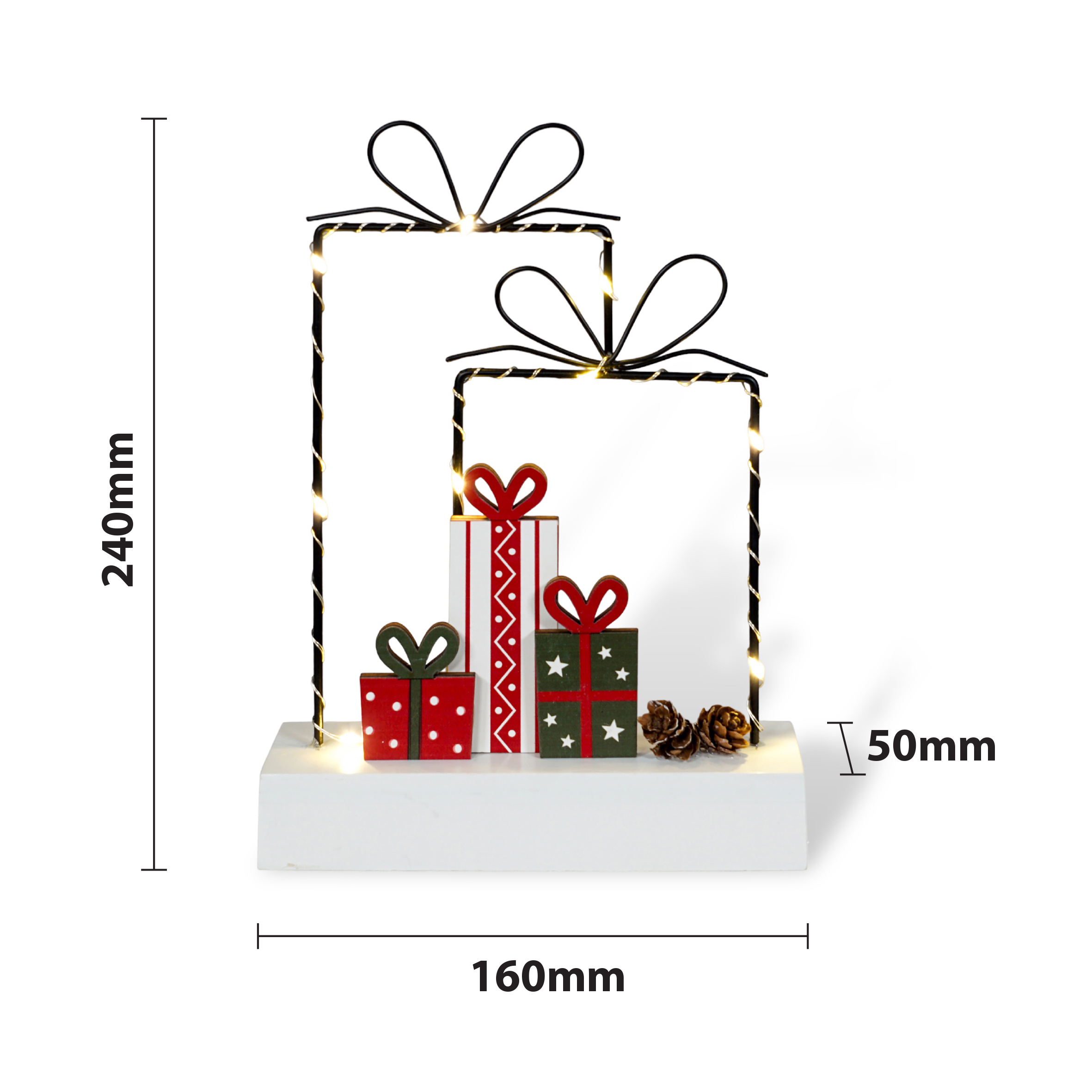 - Beautifully wrapped presents adorned within a wired frame with bright LED lights