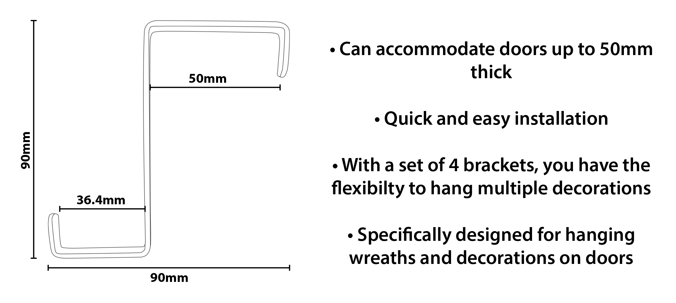 Xmas Haus Christmas Festive Z Shaped Brackets! This set of 4 white brackets is specifically designed for mounting wreaths and decorations on doors, both inside and outside. With their sturdy construction these brackets offer a convenient and reliable solution for showcasing your holiday decor. The Z-shaped brackets are crafted to securely hold wreaths and decorations on doors up to 50mm (2″) thick. Whether you have a traditional front door, a glass door, or even a thicker door, these brackets can accommodate various door types, providing versatility and ease of use.