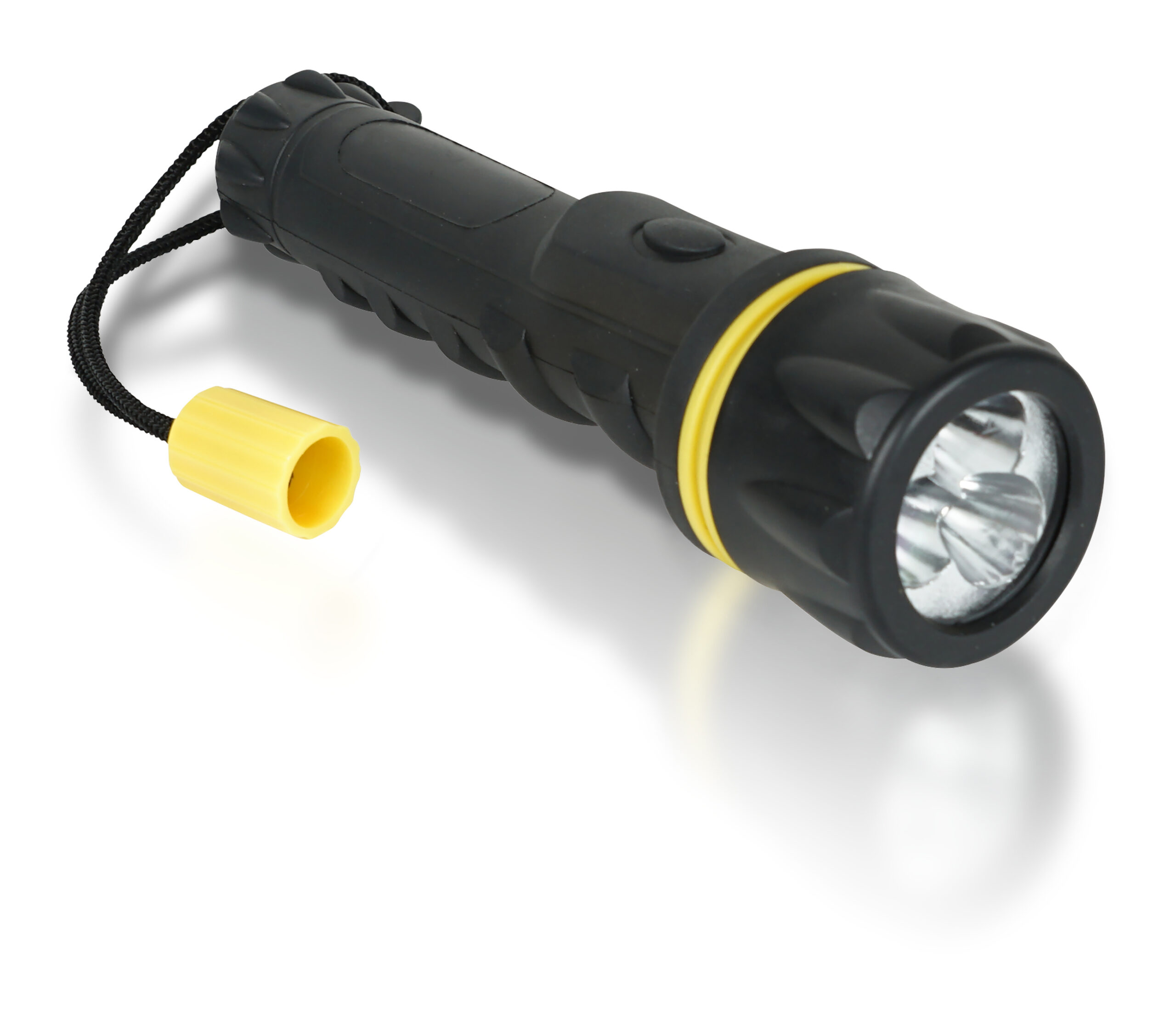 Eagle heavy duty rubber shock and water resistant torch flashlight with anti roll design and hand strap. The product uses 2 X AA batteries (not supplied)