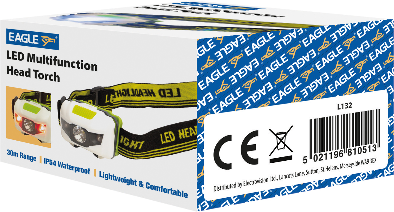 See and be seen at all times with this LED head torch from Eagle. The torch features 3 ultra bright LEDs and 4 different flashing modes. A range of up to 30m makes this head torch ideal for cycling, running, hiking, fishing, camping and other outdoor pursuits where a light is needed during night time hours, the light is also equally suited to work environments or DIY projects. Super comfortable to wear thanks to the Lycra headband, it is made from ABS plastic making it very light. Waterproof to IP54 meaning rain will not spoil your fun. When 3 x AAA batteries are inserted (not supplied) the light will work for up to 4 hours.