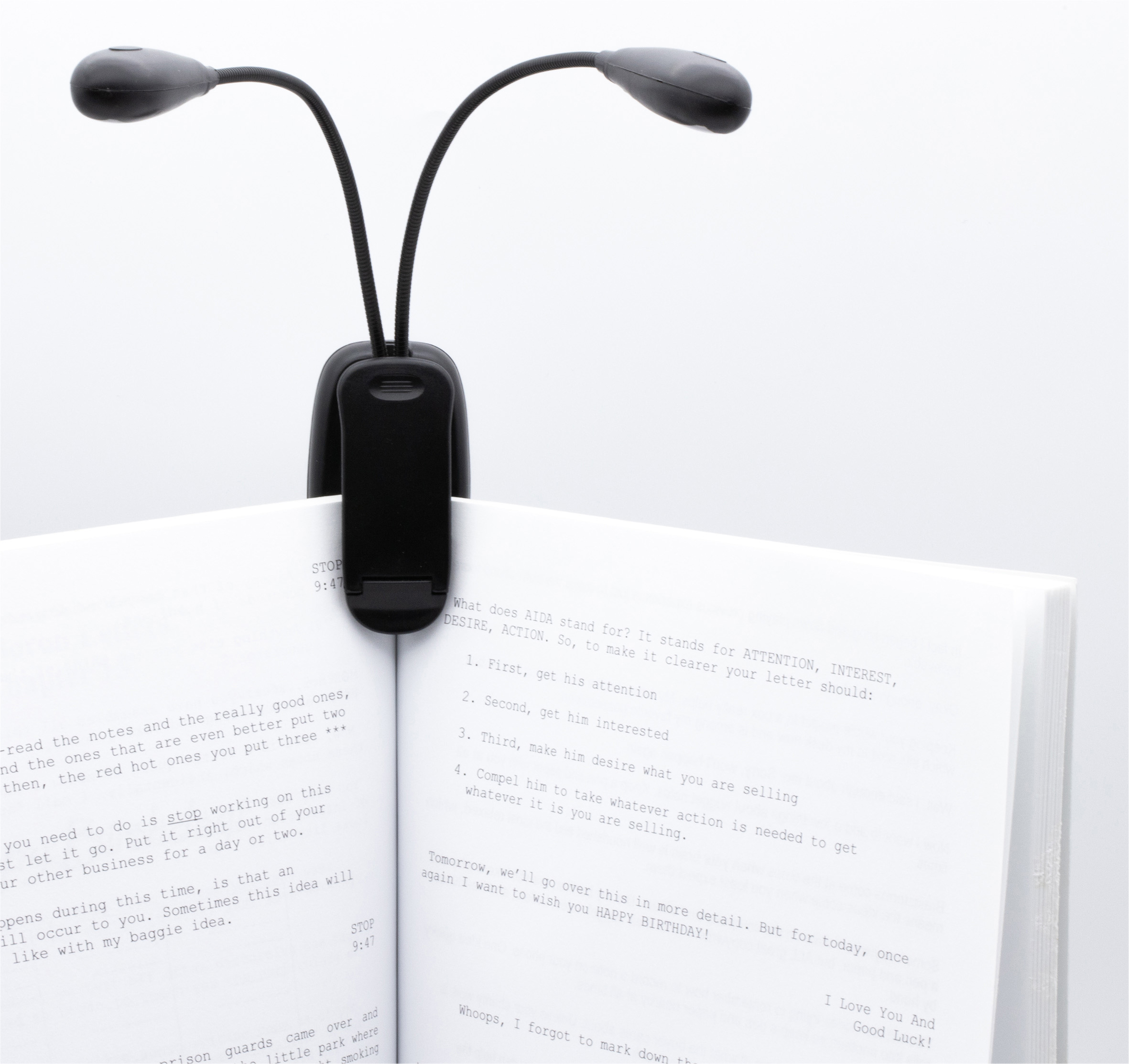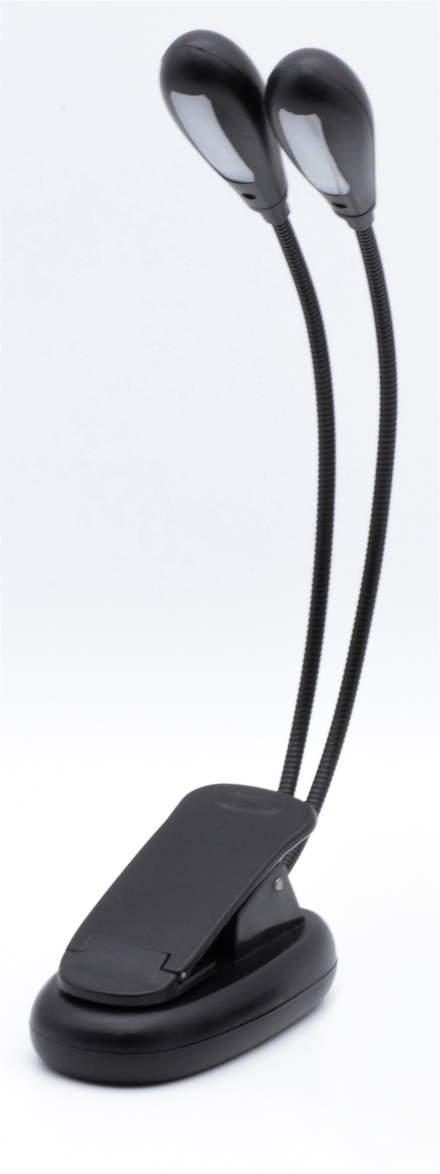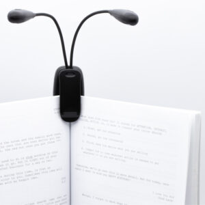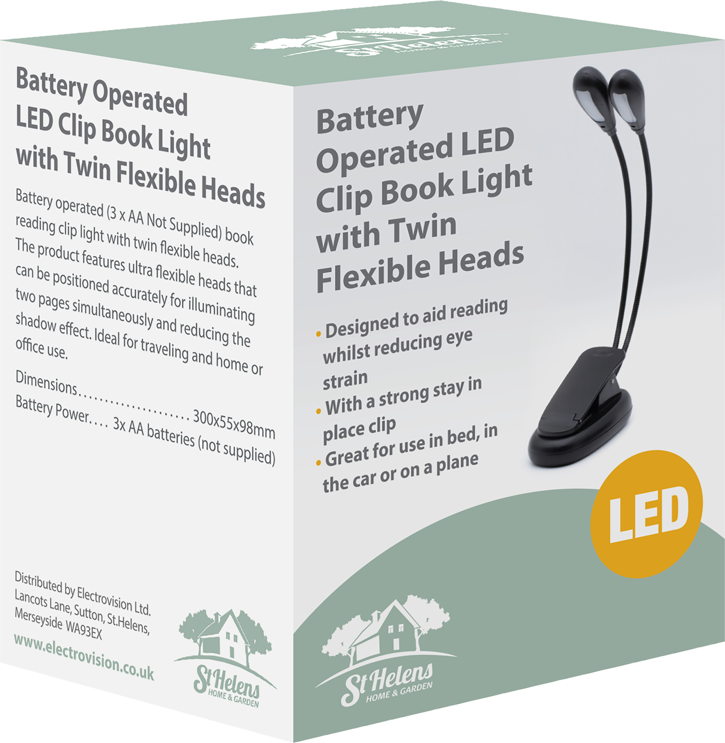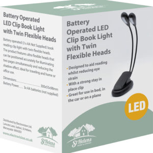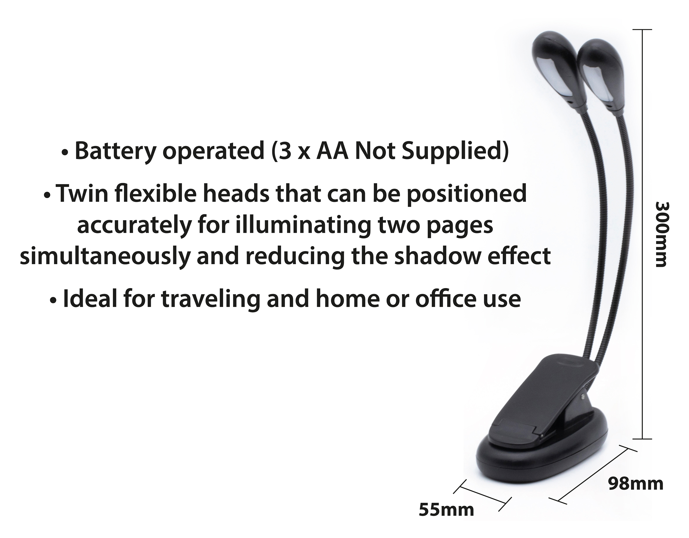 Battery operated (3 x AA Not Supplied) book reading clip light with twin flexible heads. The product features ultra flexible heads that can be positioned accurately for illuminating two pages simultaneously and reducing the shadow effect. Ideal for traveling and home or office use.