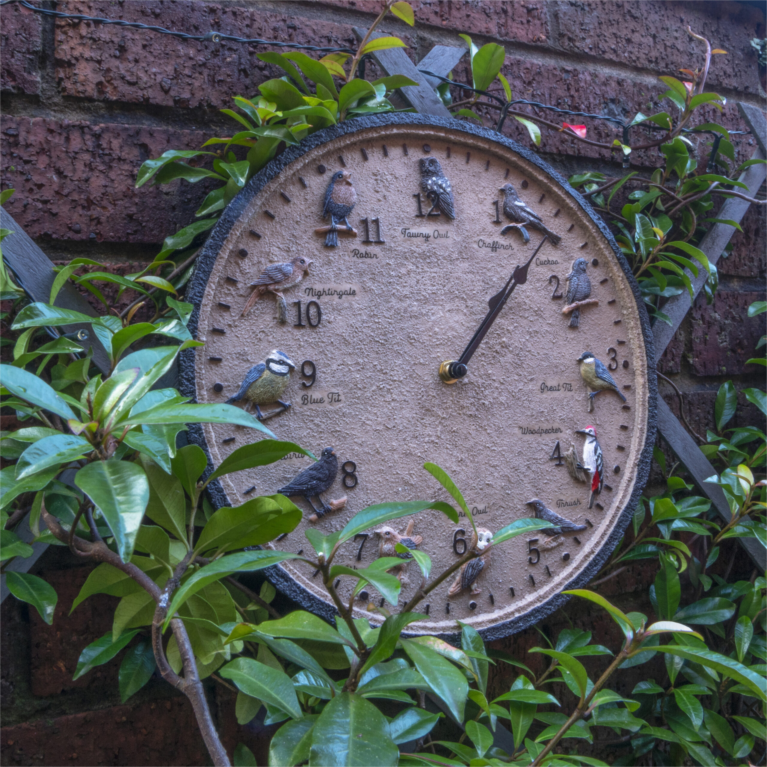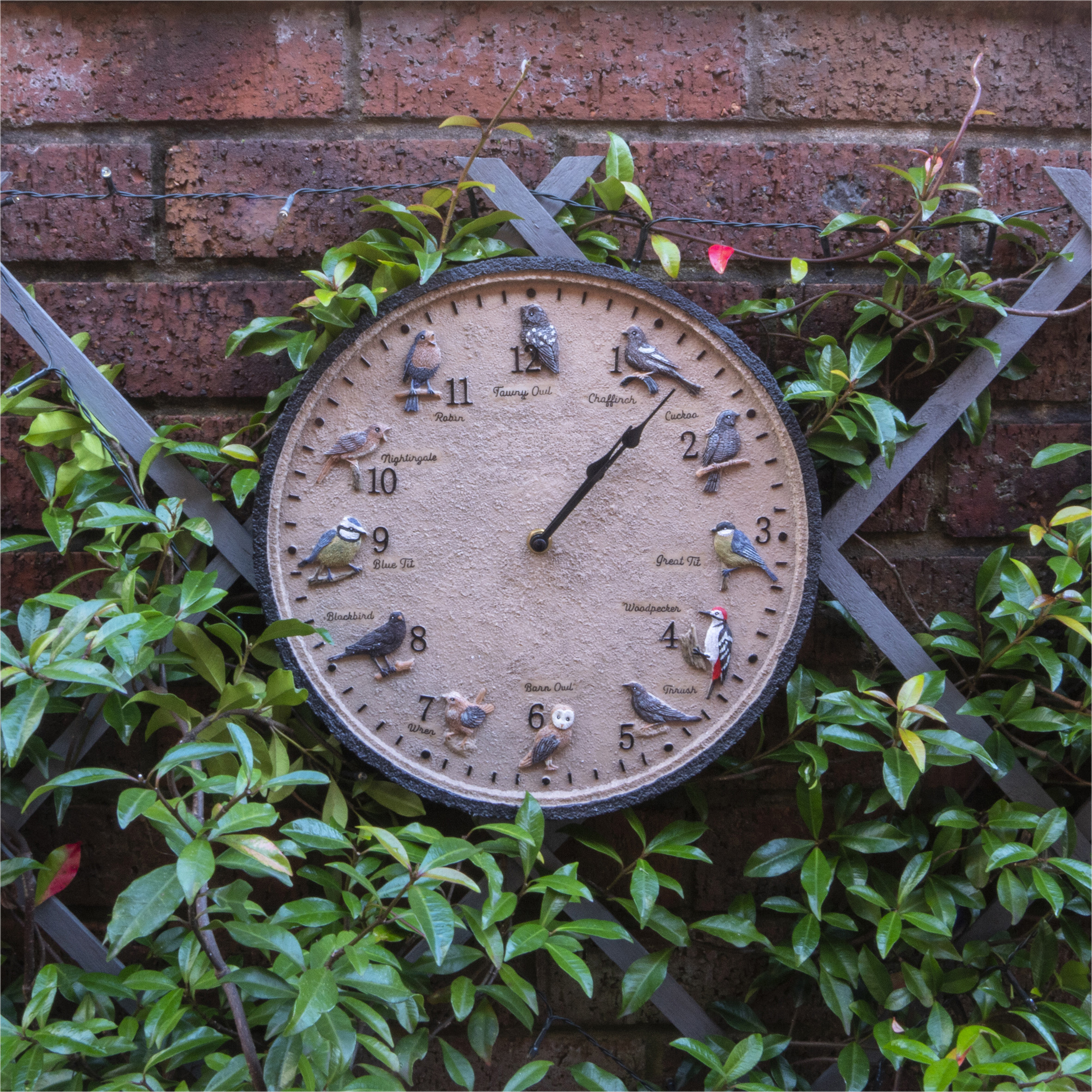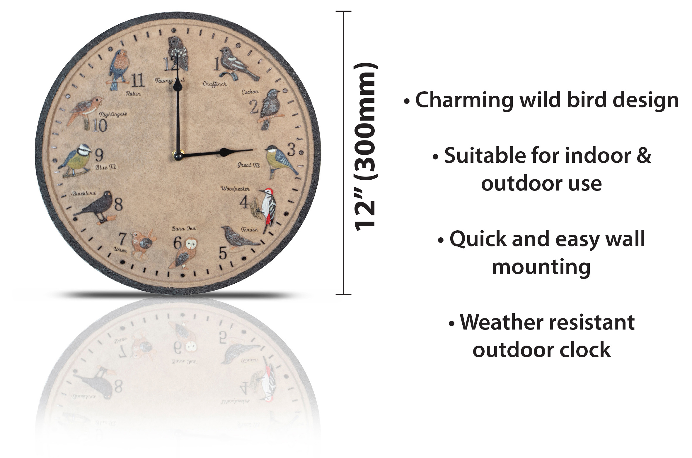 This fabulous decorative outdoor wall clock from St Helens & Home Garden would make a welcome addition to any garden thanks to its charming wild birds design. The clock is hand painted and made from polyresin making it long lasting and suitable for the rigours of outdoor use. Supplied with a key slot making it extremely quick and easy to mount on outdoor walls, fences, summer houses, conservatories and sheds. Sit back, enjoy the beauty of your garden and literally watch time go by.The clock features a tawny owl, chaffinch, cuckoo, great tit, woodpecker, thrush, barn owl, wren, blackbird, blue tit, nightingale and a robin.The clock requires 1x AA battery (not supplied).