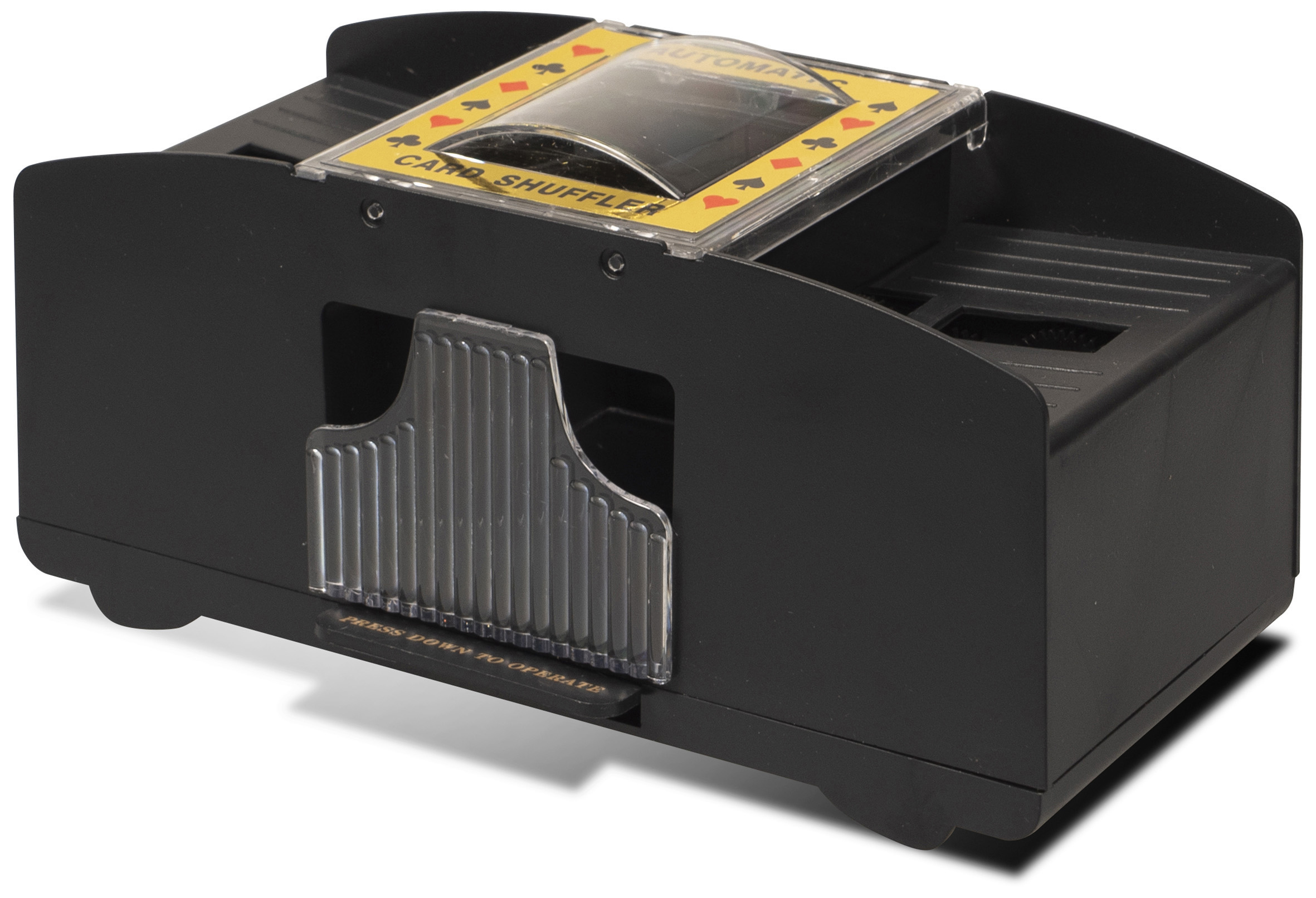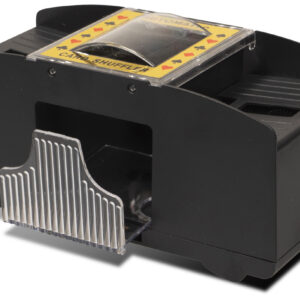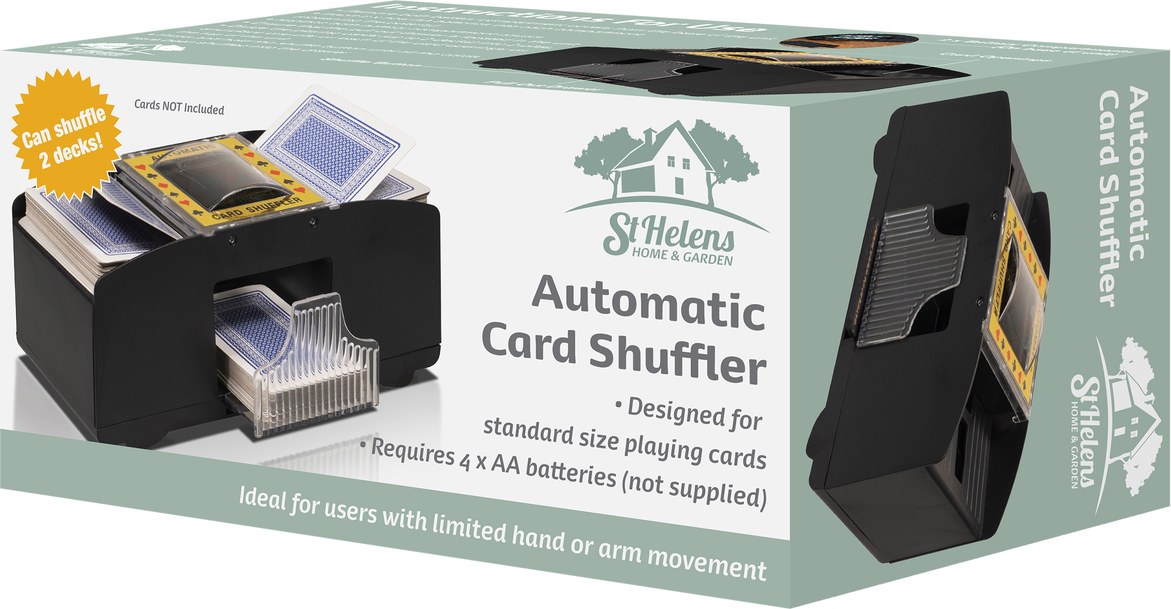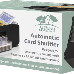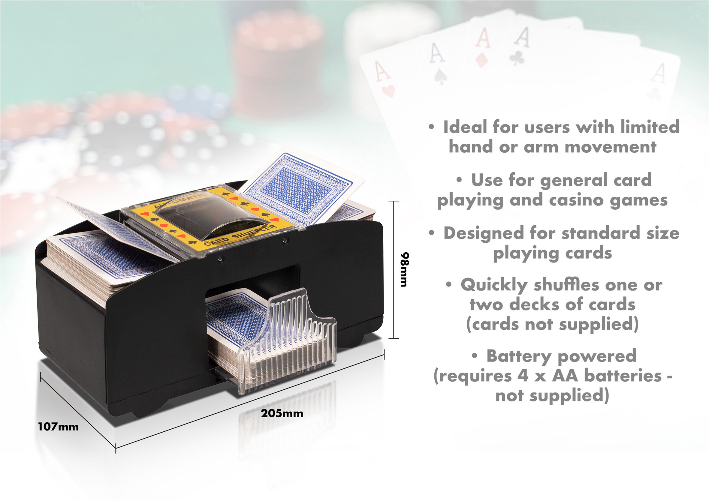 The Card Shuffler is designed for use with one or two packs of standard playing cards (not supplied) and is ideal for general card playing including bridge or casino games such as poker, as well as being a great product for those with limited use of their hands due to arthritis or other conditions. The portable Automatic Card Shuffler is battery powered (4 x AA batteries – not supplied), so requires no power lead or socket. Operation is by a simple push button to stop/start the shuffling motor.