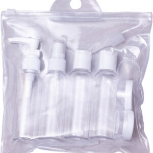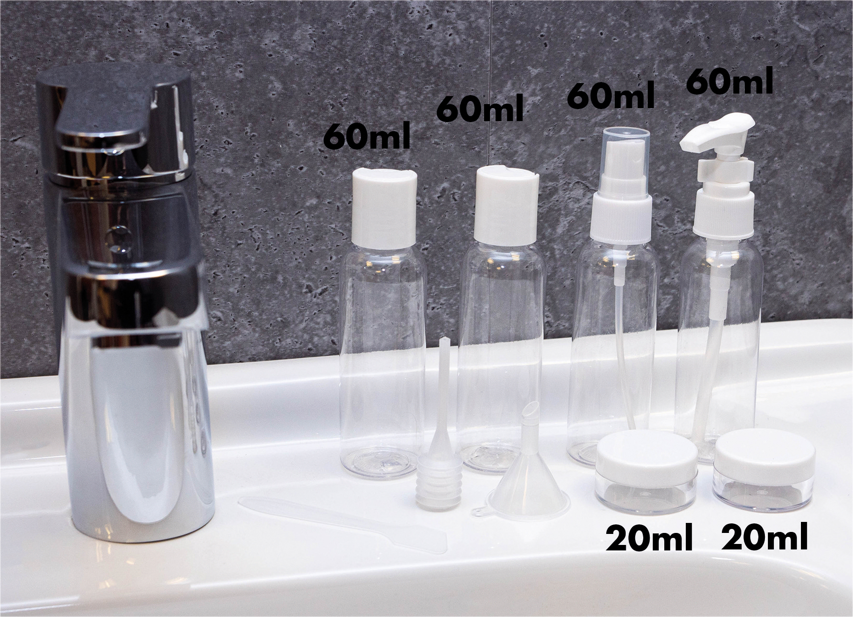 These travel bottles and accessories are the perfect size to use on planes, they can also be used for holidays, swimming, camping trips and the gym. The set is ideal for use with shampoo, conditioner, shower gel, body cream, sun cream and all liquid cosmetics. The set contains 2 pieces 60ml flip cap bottles, 1 piece 60ml spray bottle, 1 piece 60ml pump bottle, 2 pieces 20ml cream jars, 1 piece pipette, 1 piece funnel and 1 piece spatula. The 3 tools make filling and using the bottles very easy with no mess. Each bottle and jar closes tightly to ensure there are no leaks or spillages in your luggage or bag.