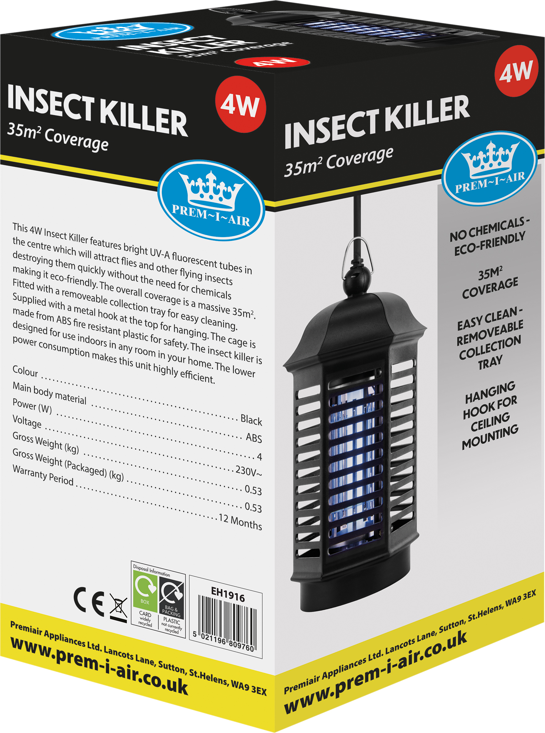 This 4W Insect Killer features bright UV-A fluorescent tubes in the centre which will attract flies and other flying insects destroying them quickly. This unit is designed to be eco-friendly as it does not utilise harmful chemicals making it perfect for homes with children and pets. The overall coverage is a massive 35 sq.m. Fitted with a removeable collection tray for easy cleaning. Supplied with a metal hook at the top for hanging. The cage is made from ABS fire resistant plastic for safety. The insect killer is designed for use indoors in any room in your home. The lower power consumption makes this unit highly efficient.