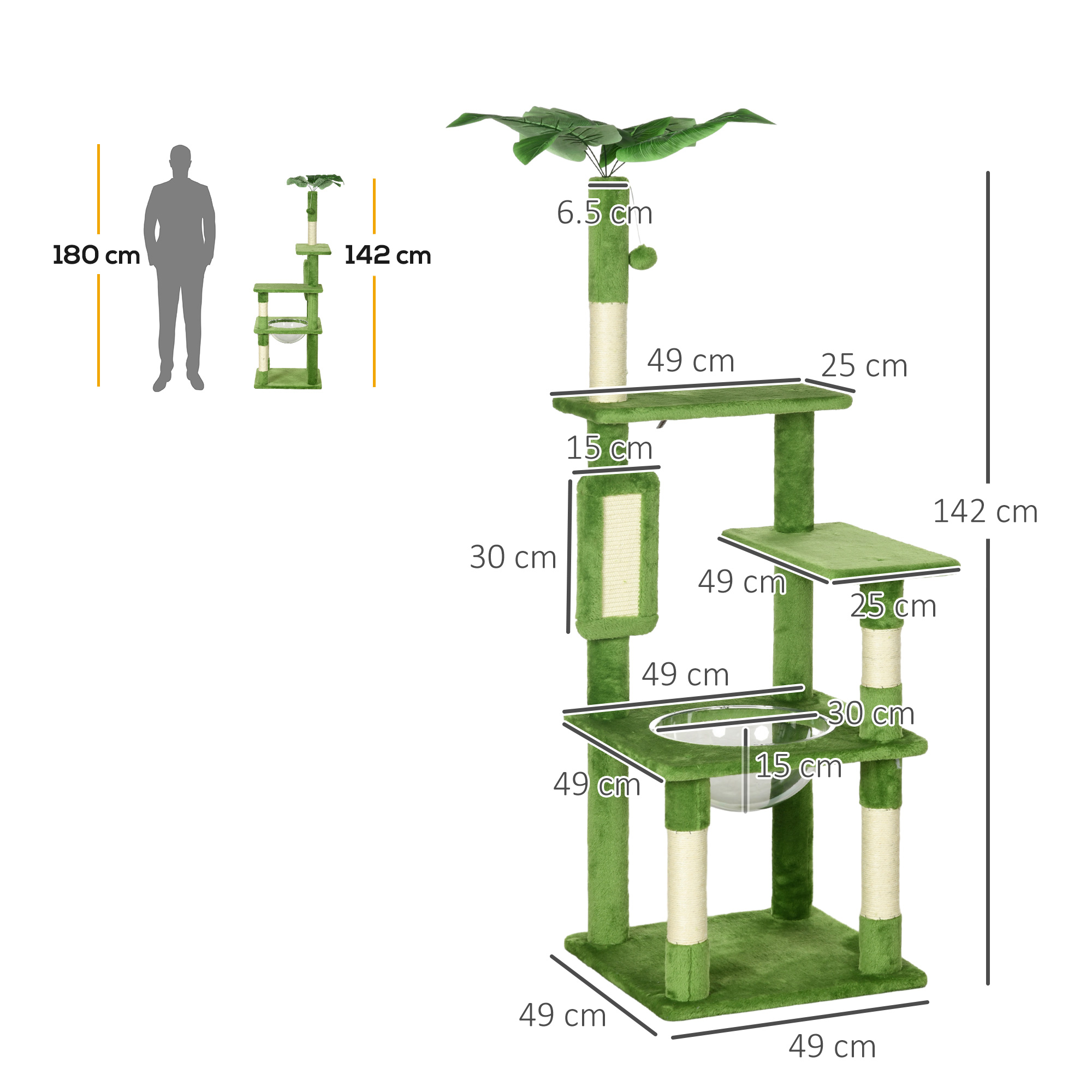 - Overall dimensions: 142H x 49W x 49Dcm. Hammock: 15H x 30L x 30Wcm. Top platform: 49L x 49Wcm. Third platform: 49L x 25Wcm. Second platform: 49L x 25Wcm