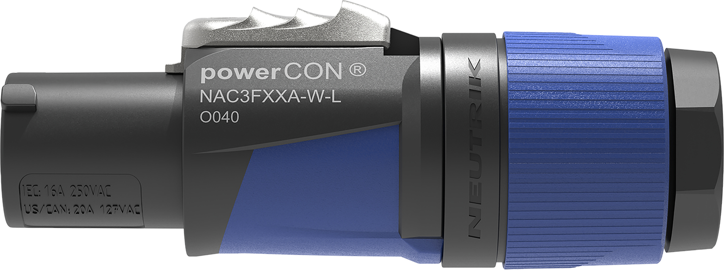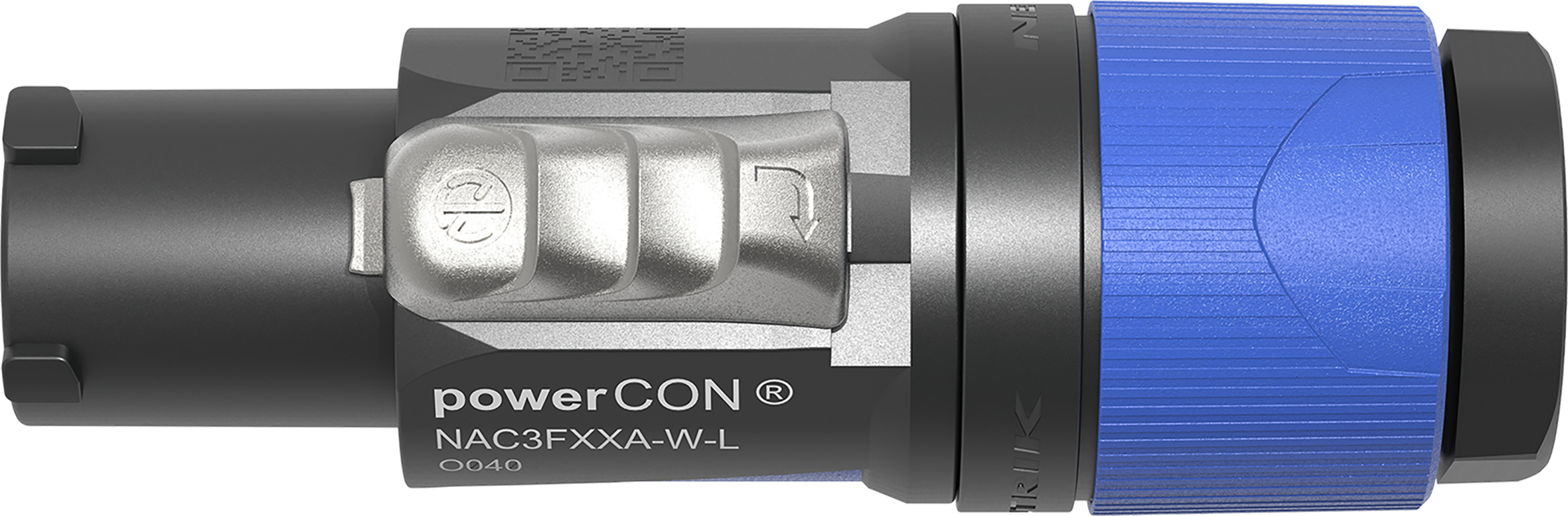 Locking AC mains cable connector, keyed and color coded (blue) for power-in, screw terminal assembly, for cable diameters 10 – 16 mm. The powerCON FXXA/FXXB is a single phase (3 conductor) lockable power connector with Circuit Breaking Capability when mated with powerCON XX Series receptacles. It replaces appliance couplers wherever a very rugged solution in combination with a locking device is needed to guarantee a safe power connection. (Requires a T8 Torx Driver to tighten the terminals, and a 22mm Spanner to undo the Plug )