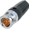 BNC chassis mounting female socket, all metal bright plated with a cut out of 10 mm and 4 hole fixing (2.5 mm) on 12 mm centres.