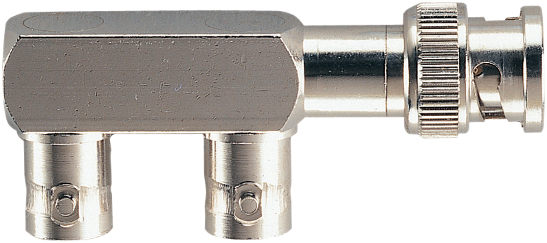 Dual right angle BNC (50 Ohm) adaptor. Metal construction with gold plated pin contacts. BNC line plug to 2 BNC chassis sockets.