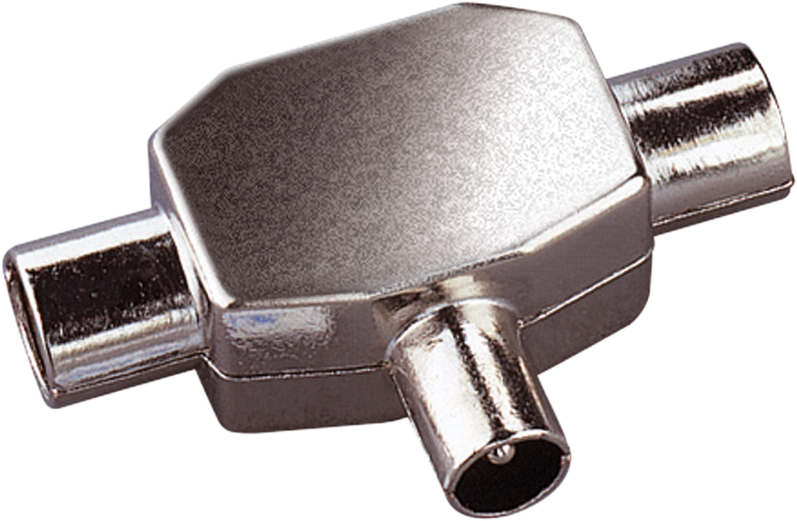 Coaxial T splitter giving two standard coaxial outlets from one single input. Line plug input to 2 coaxial line socket outputs. All metal construction.