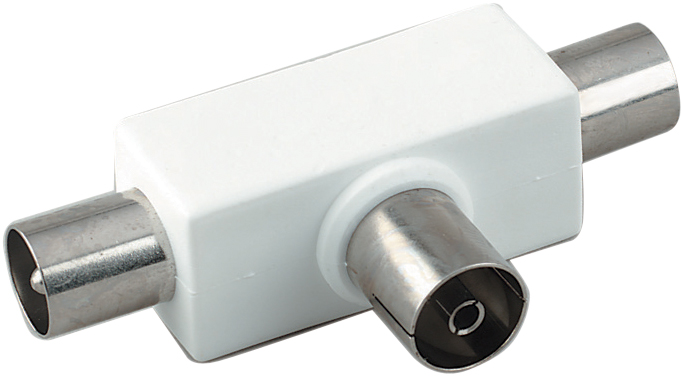 Coaxial T splitter giving two standard coaxial outlets from one single input. Line socket input to 2 coaxial line plug outputs.