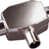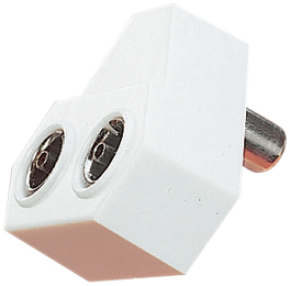 Right angle coaxial Y splitter giving two coaxial outputs from one input. Line plug to 2 x line sockets.