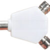 Right angle coaxial Y splitter giving two coaxial outputs from one input. Line plug to 2 x line sockets.