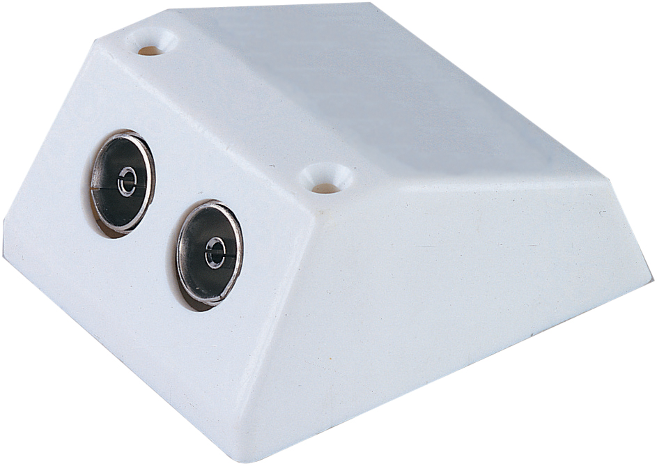 Surface mounting coaxial TV outlet. White plastic and supplied with fixing screws. Twin outlet.