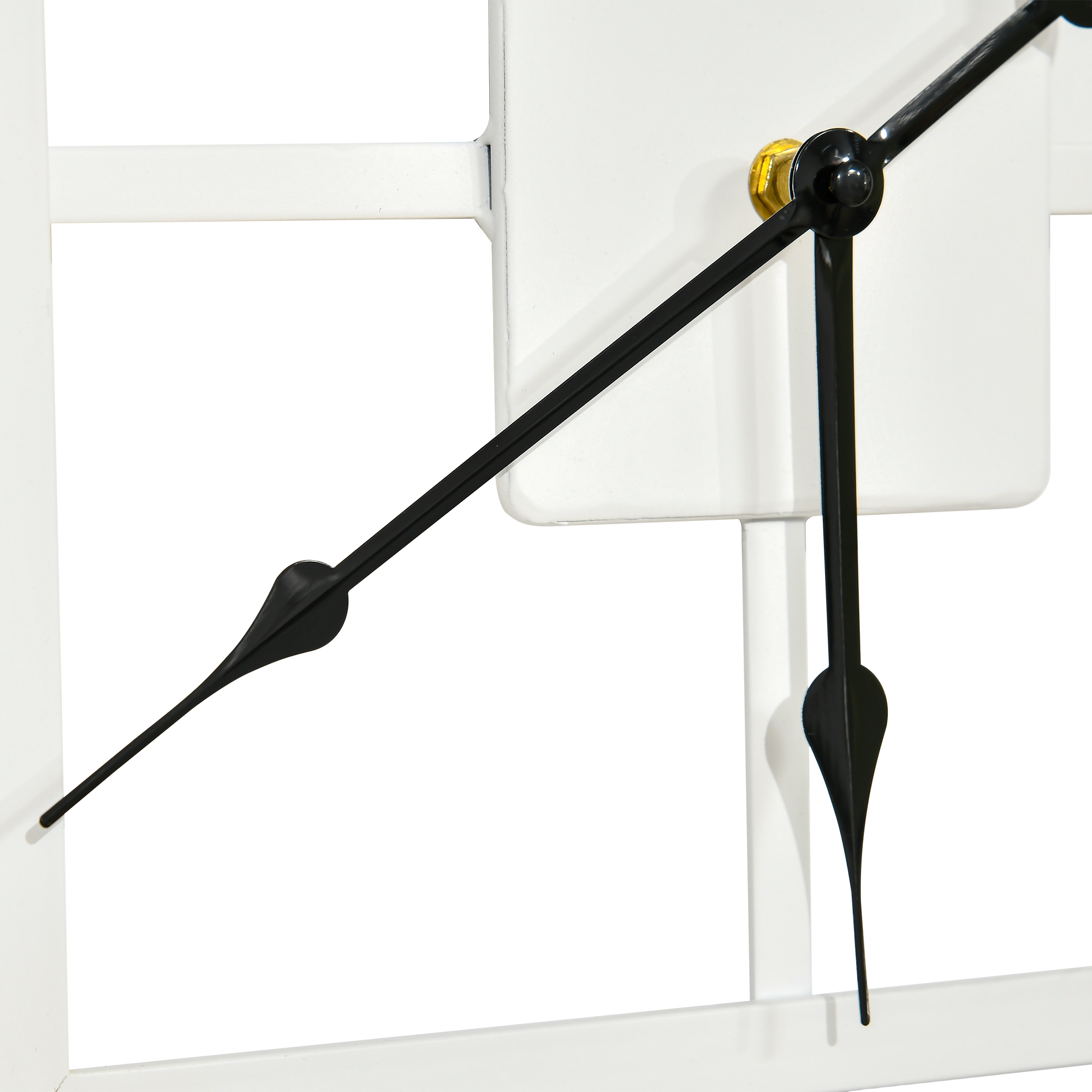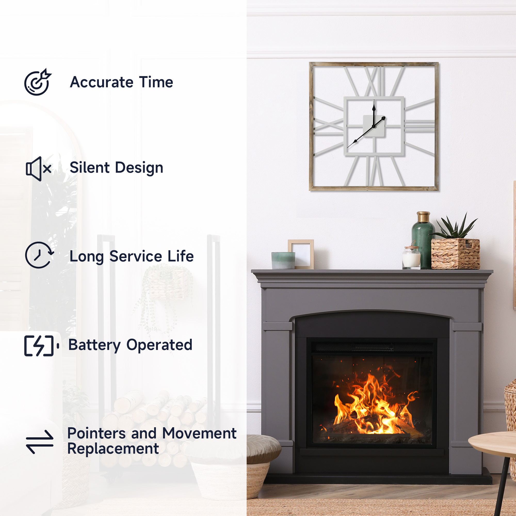 - Rustic style, the combine of metal and wood, open face, large hands, Roman numbers, distressed finish covering white fir wood frame