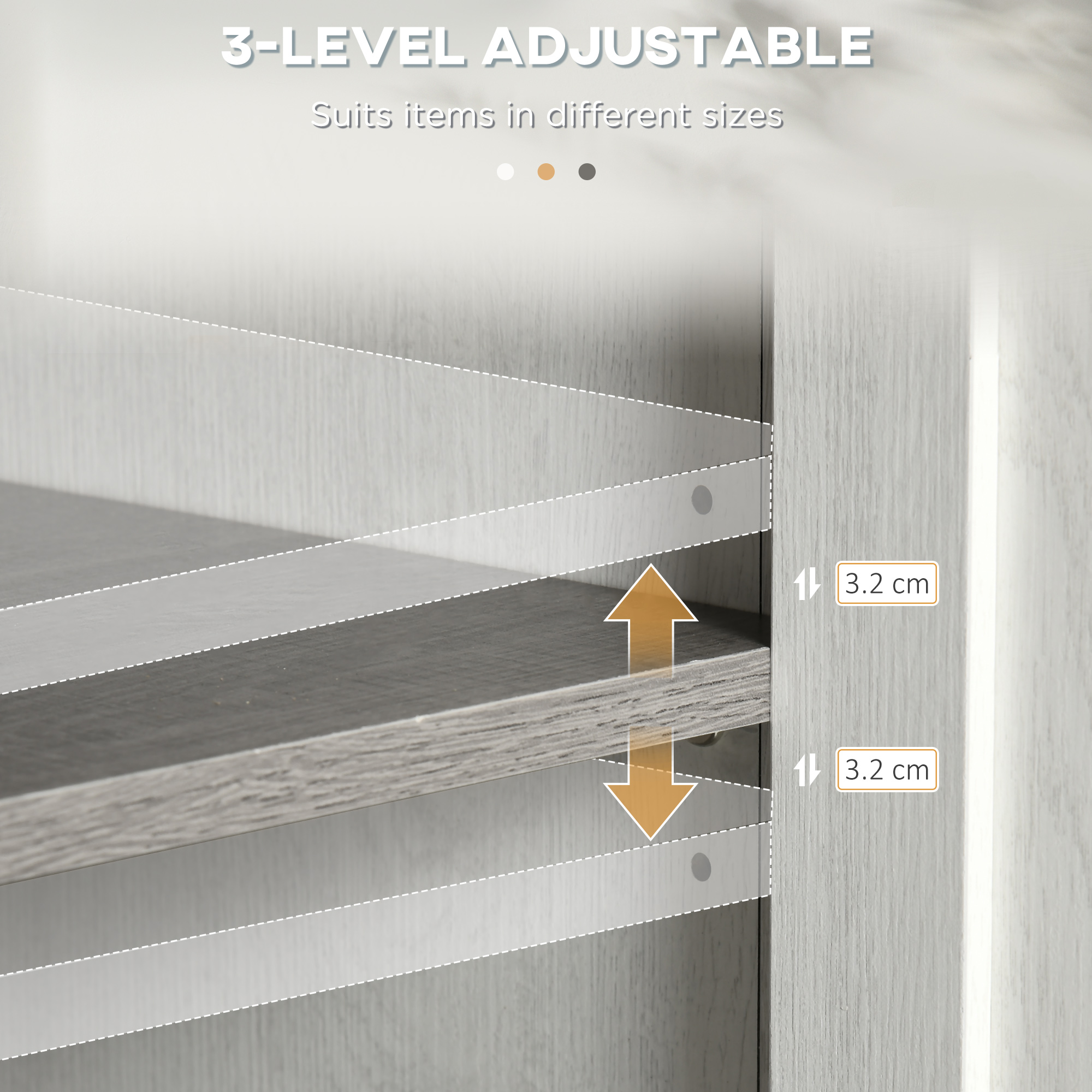 - Cupboard features a three-level adjustable shelf