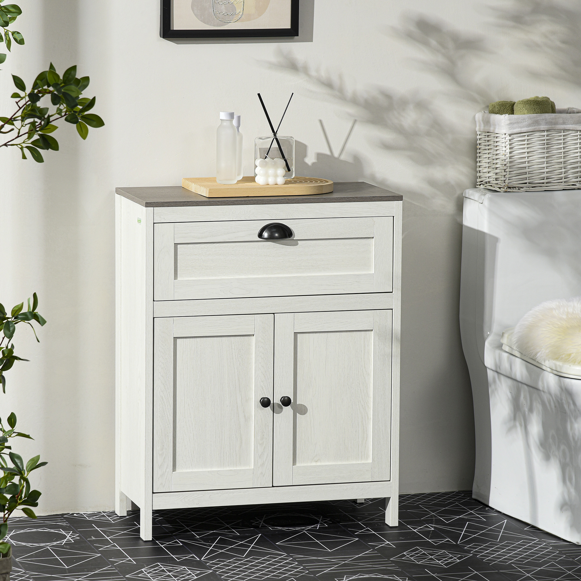 Expand storage with this kleankin bathroom storage cabinet. Made from particle board for sturdiness, it features a pull-out drawer and bottom cabinet for plenty of storage. Cabinet comes with a three-level adjustable shelf to fit in differently-sized items. A white design, with wood-effect top for classic style, looks great anywhere. Completed with anti-tipping straps on the back for safety.