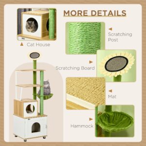 PawHut Cat Tree with Cat Litter Box for Indoor Cats, Cat Enclosure with Scratching Post, Cat Condo, Hammock, Platforms, Removable Cushions, Oak
