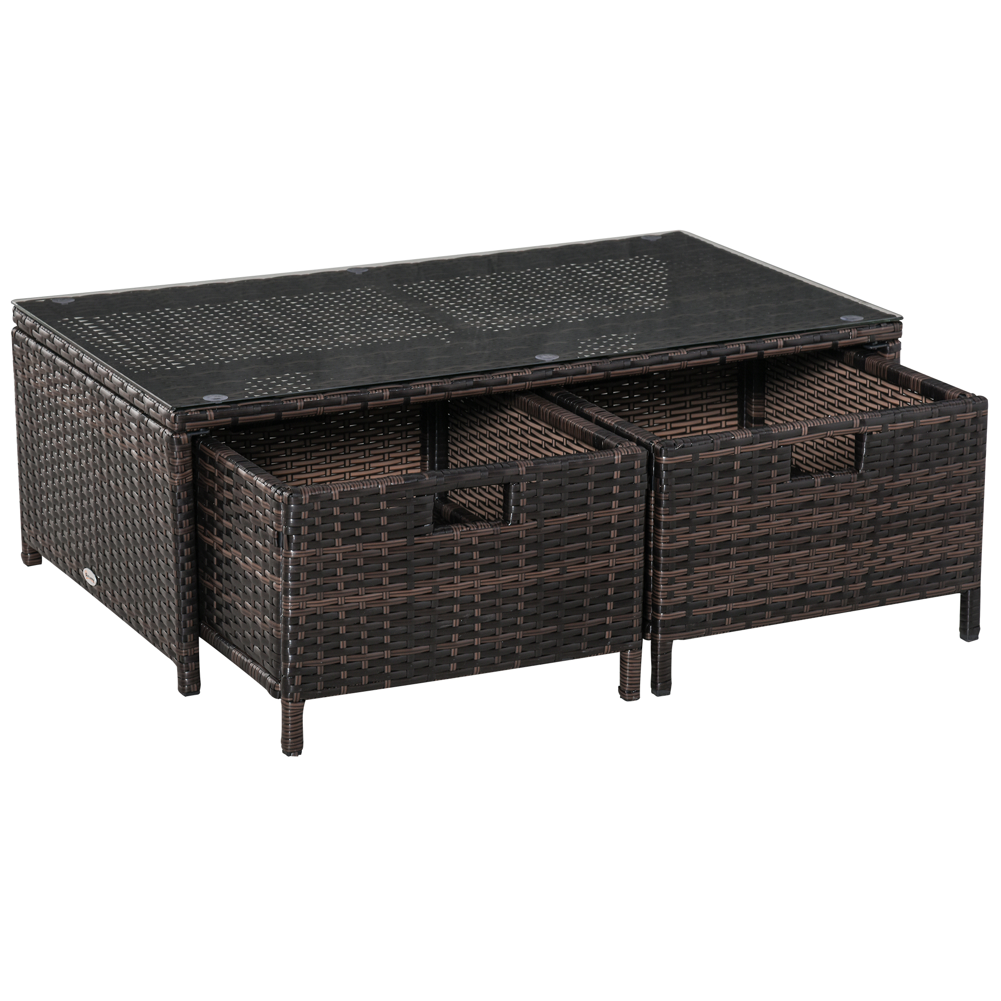 Generous in size and stylish in design, let this outdoor corner sofa from Outsunny take the lead for your outdoor leisure times this season. The small garden furniture consists of four pieces ?? two two-seater sofas, a tall storage corner table and an oblong coffee table with drawers, giving you plenty of room to relax all day by yourself or with others. Discreet storage is located both on the tall corner table of the garden furniture sets, with two drawers in the oblong coffee table.