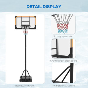 Experience the thrill of basketball with the SPORTNOW adult basketball hoop and stand. Its adjustable height caters to all ages and skill levels, ensuring everyone can join the fun. Built with a powder-coated steel frame for lasting durability, its base is customisable with water or stand for stability. Moving the stand is effortless, thanks to the bottom wheels, allowing precise placement. Whether solo practise or team play, enjoy the exhilarating sound of the ball swishing through the net.