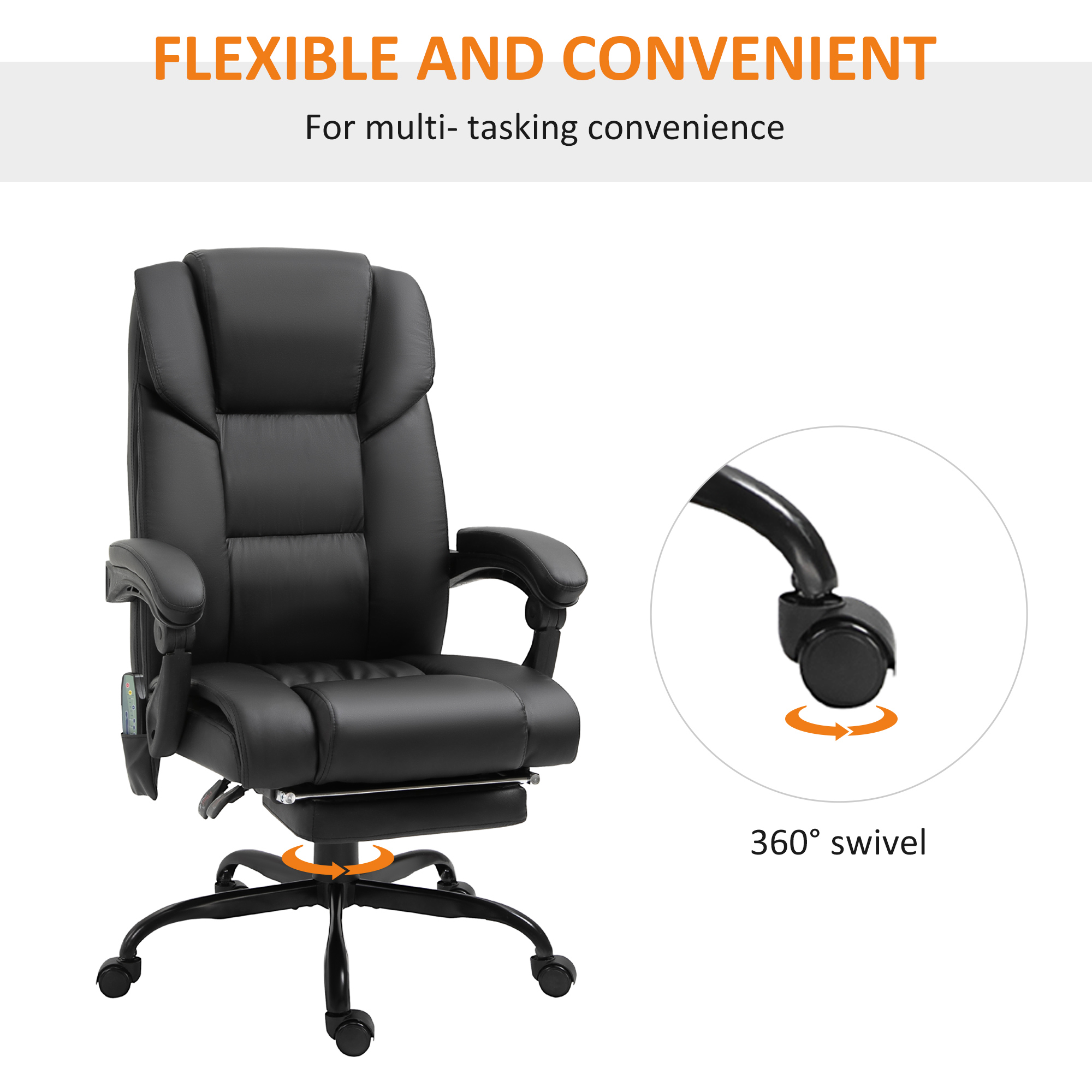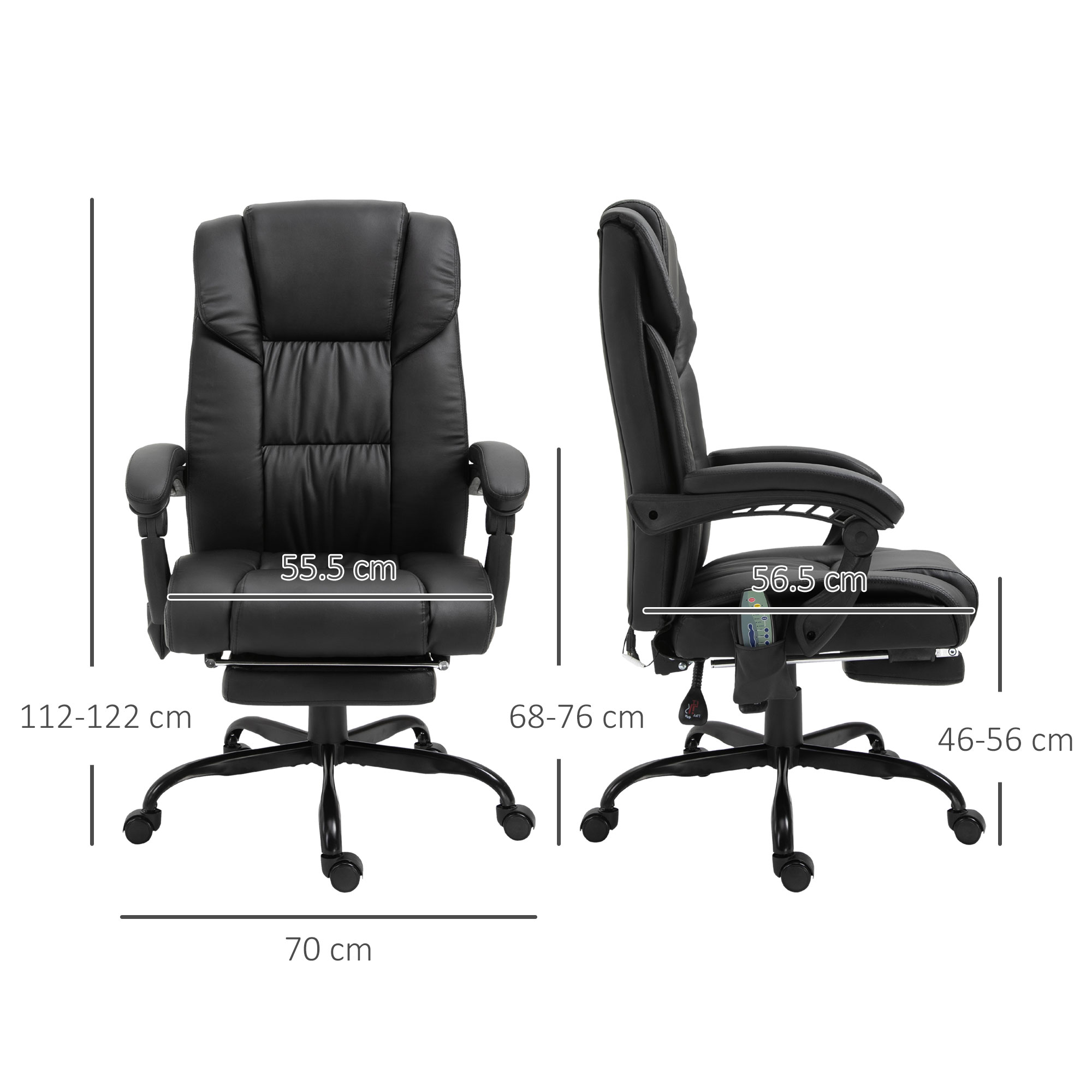 Give yourself a professional-feeling massage in your own home with this chair from Vinsetto. An executive design for style in your home office, it has six different massage points: two on the shoulders, two in the lower back and two on the thigh area. Height adjustable between 112cm and 122cm via the lever below the chair. 130?¨ reclining back pairs with the manual footrest to relax whenever. Complete with five wheels on the base.