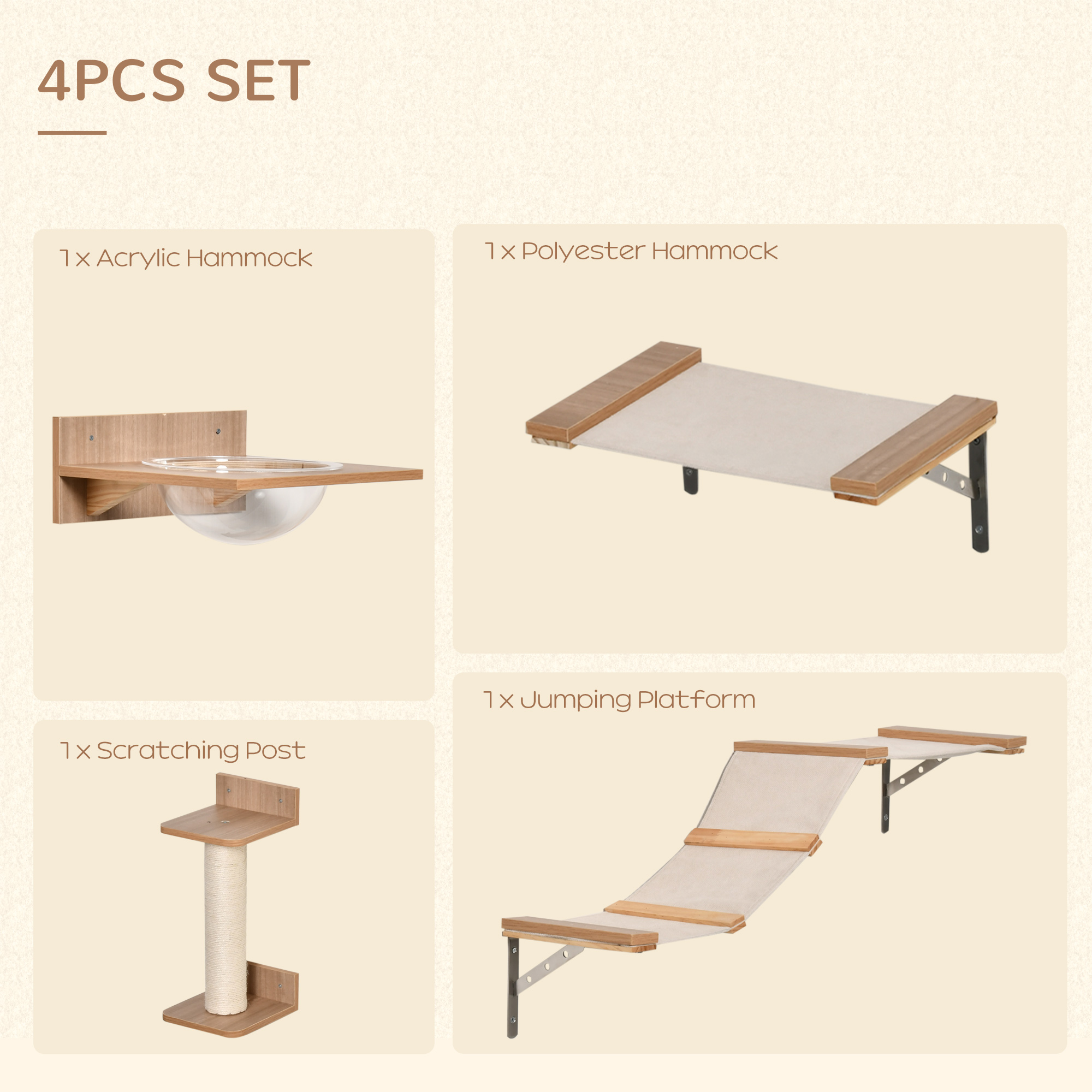 A place for them to jump, their own spots others can not get to. This PawHut four-piece on-wall set is a must for all kittens and cats. Set comes with: a clear-bowl hammock, small and long platform and scratching post: each piece with the metal can be attached to the wall – freestanding so you can attach them anywhere you want. Sisal rope wrapped on the post gives cats a place to sharpen their claws safely. It’s time to curb their curiosity, all day – every day.